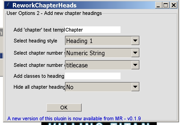 Plugin Update: Fixed a bug concerning the Add numbered heading only option where the chapter heading text was also being wrongly displayed with the chapter number(v0.1.9).