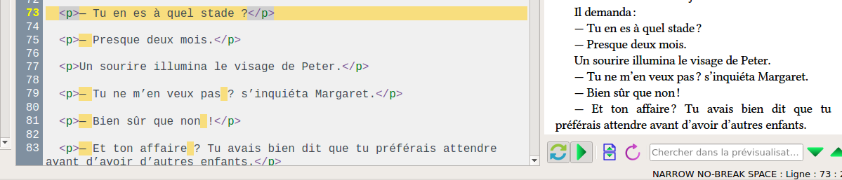 If I understood correctly (I got a little help about it), I can now get rid of my "160" preserved entity in the Preferences. As you may know, French are particularly sensitive about no-break spaces because they have to make an intensive use of them. We use nbsp and nnbsp (coded in their own ways). Replacing the original two short underlines (Kevin's own) with one bold underline (Becky's own) seems better for visibillity. Would it be possible to go one step further (à la Calibre) and display a yellow highlight (see screenshot) ? I think the visibility would be even better. Last edited by roger64; 06-12-2019 at 03:01 AM. |