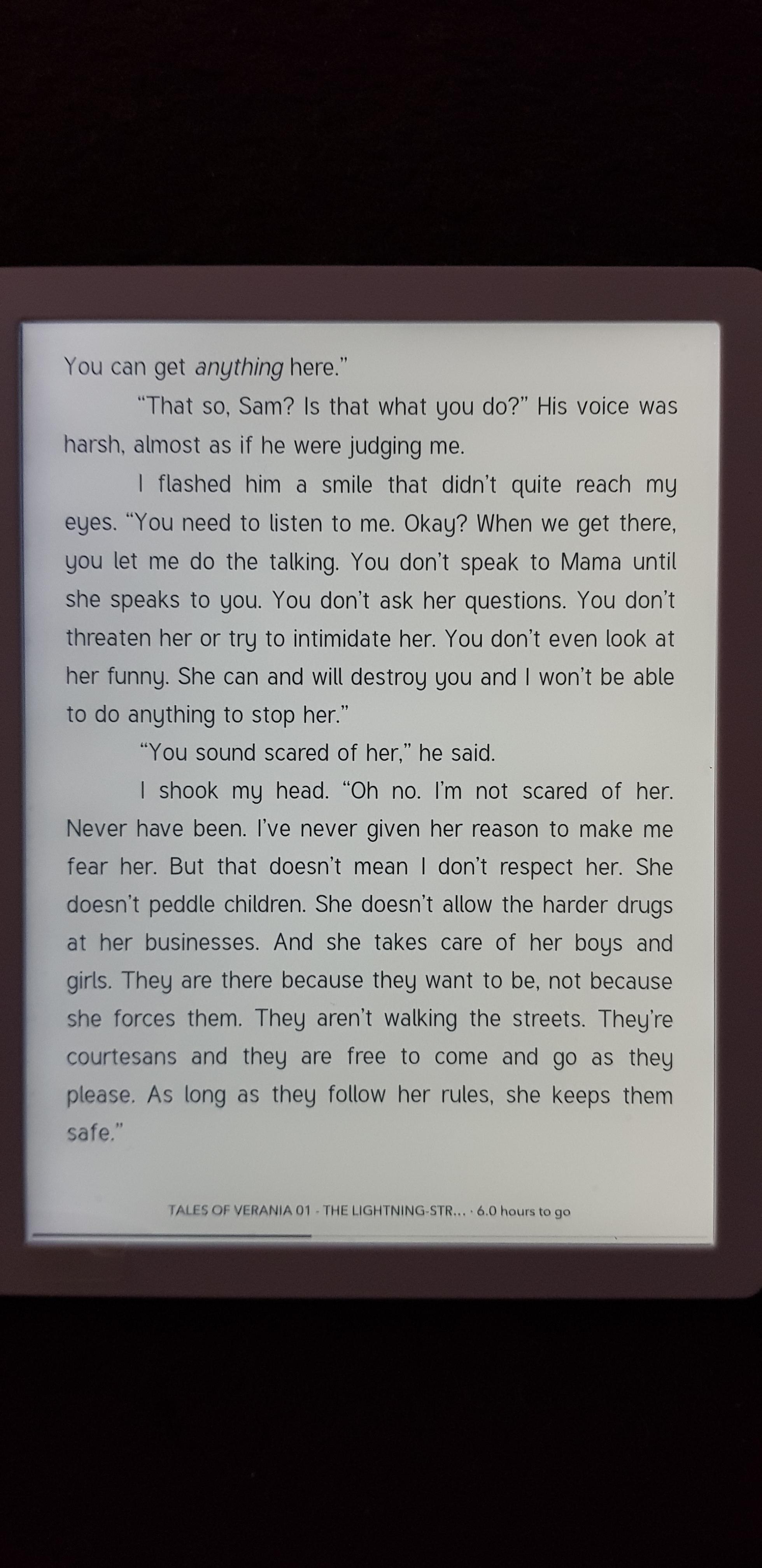 First picture is of the Libra, and I've added a picture of my Oasis 3. I know the font is different and the Libra pictures is a bit fuzzy at some places, but you can see the difference in lighting pretty well. Last edited by SusanReads; 10-25-2019 at 09:09 AM. |