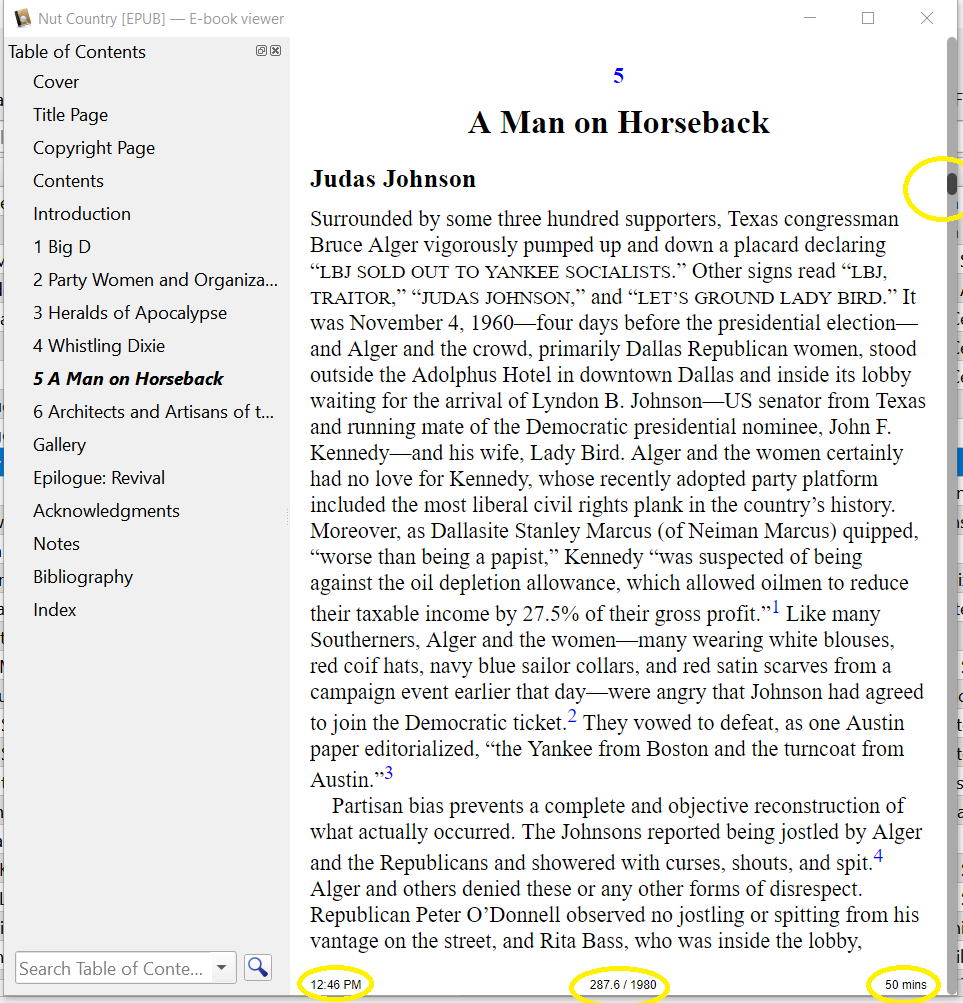 If you have ideas to improve the viewer then ask Kovid and see if they can be implemented. Whining is counter-productive. Attached is the way I like it. If I wanted a scroll bar on the right I would enable it in preferences. If I wanted the Table of contents (TOC) I would press ctrl T or open it in preferences. The TOC will remain showing across books as long as you keep it open. Hard to see here, but I show the time of day in the top right header. Last edited by DoctorOhh; 10-28-2019 at 02:07 AM. |