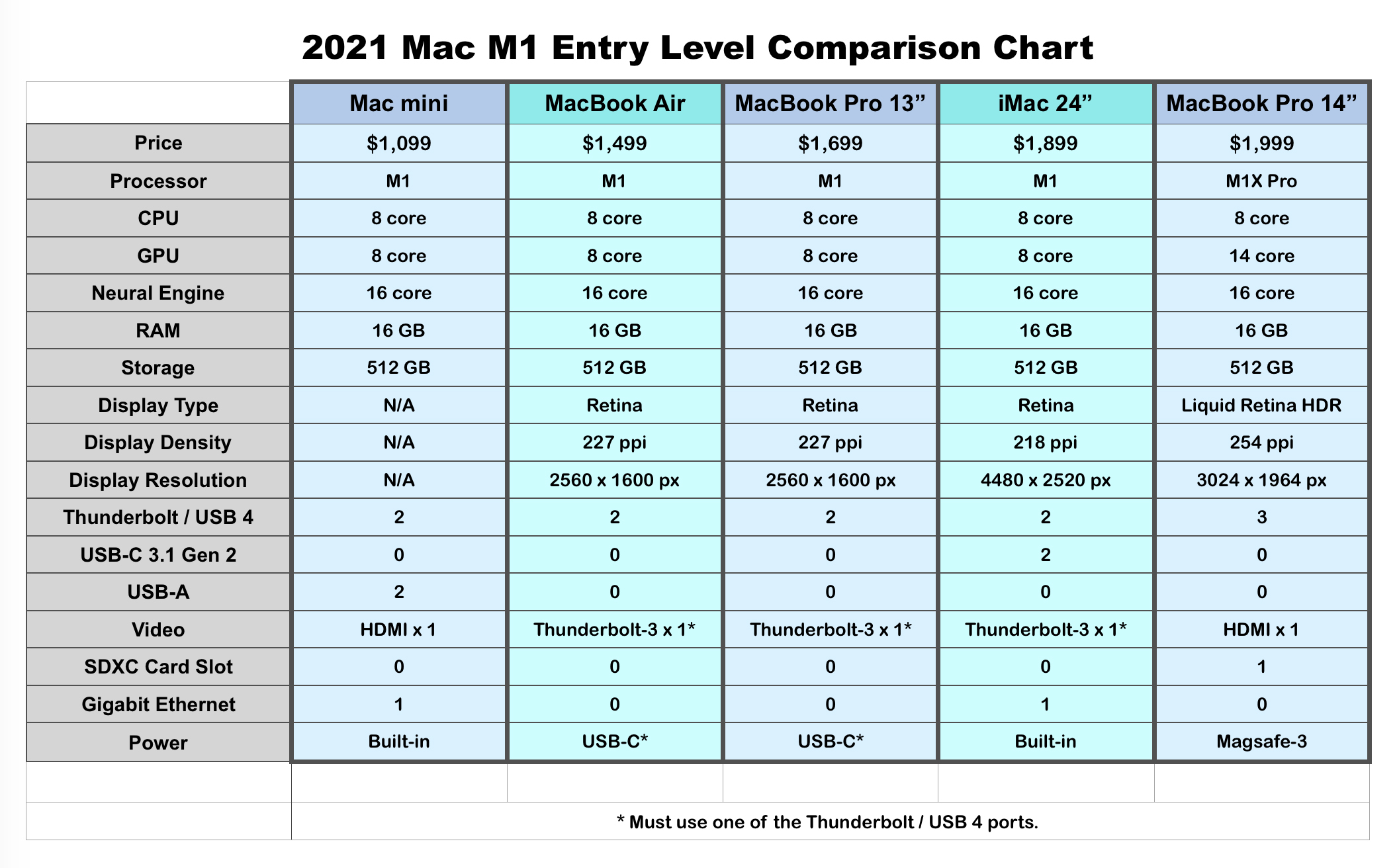 At any rate, the attached image shows the spreadsheet chart. I’m leaning toward the Mac mini as I already have a good monitor, keyboard, mouse, etc. I thought I would post this in case anyone wants to take a quick look at the price range between similarly equipped Mac models. ETA 26 Oct 2021: The MacBook Air display is Retina. (I originally left out the word "Retina" and have now updated the chart.) At 400 nits it is not as bright as the 500 nits one in the MacBook Pro 13" though. …. Last edited by OtinG; 10-26-2021 at 10:37 AM. |