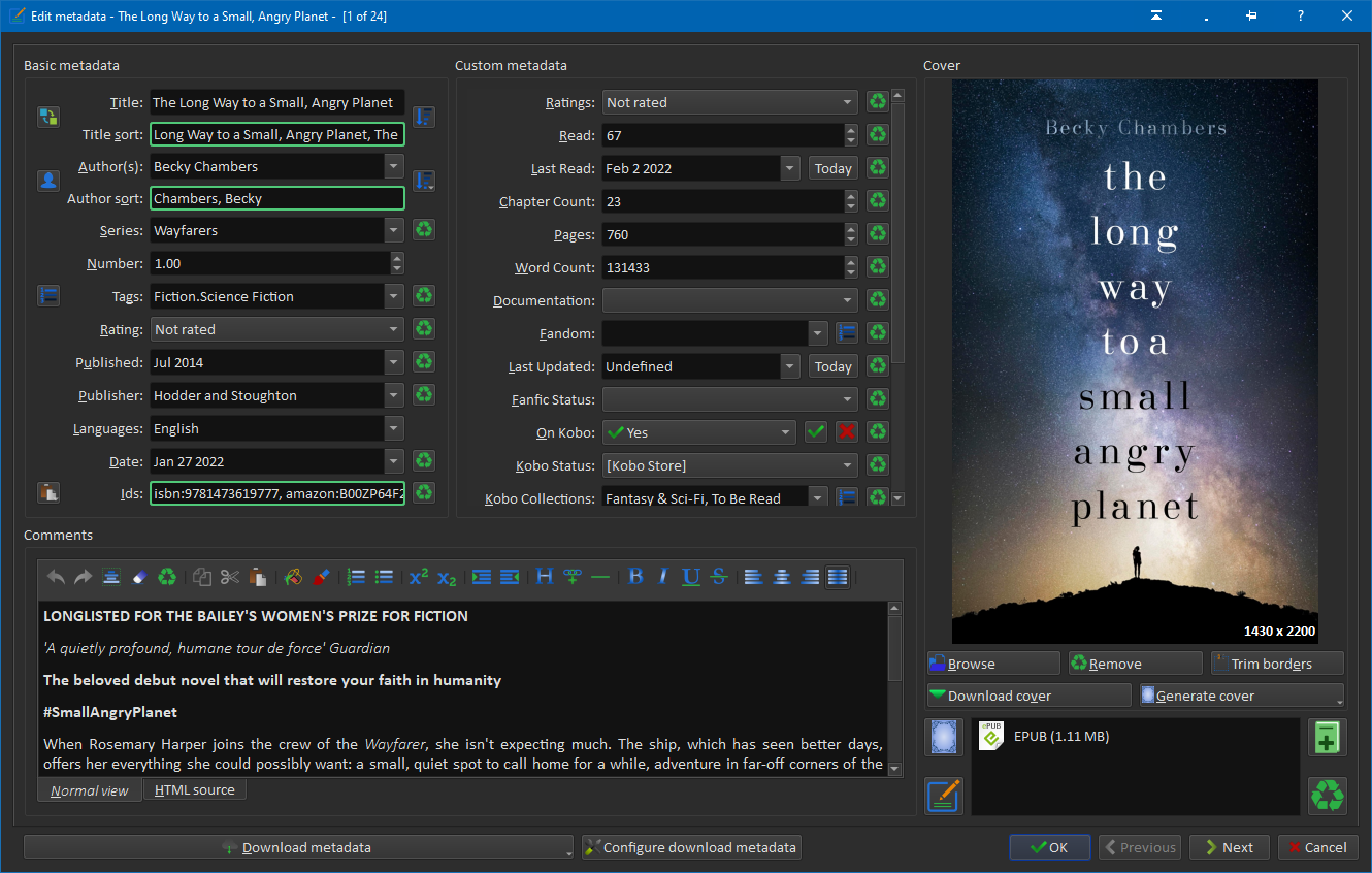![]() Small question: In one-tab mode, is there a way to fix the "Kobo Collections" clipping at the bottom here? Resizing the window just makes the comments area bigger, and I can't resize the sections individually. ![]() seems to be a bit of misalignment too on the lower columns -- are dropdown fields a slightly different height or something? Last edited by ownedbycats; 02-03-2022 at 12:23 AM. |
