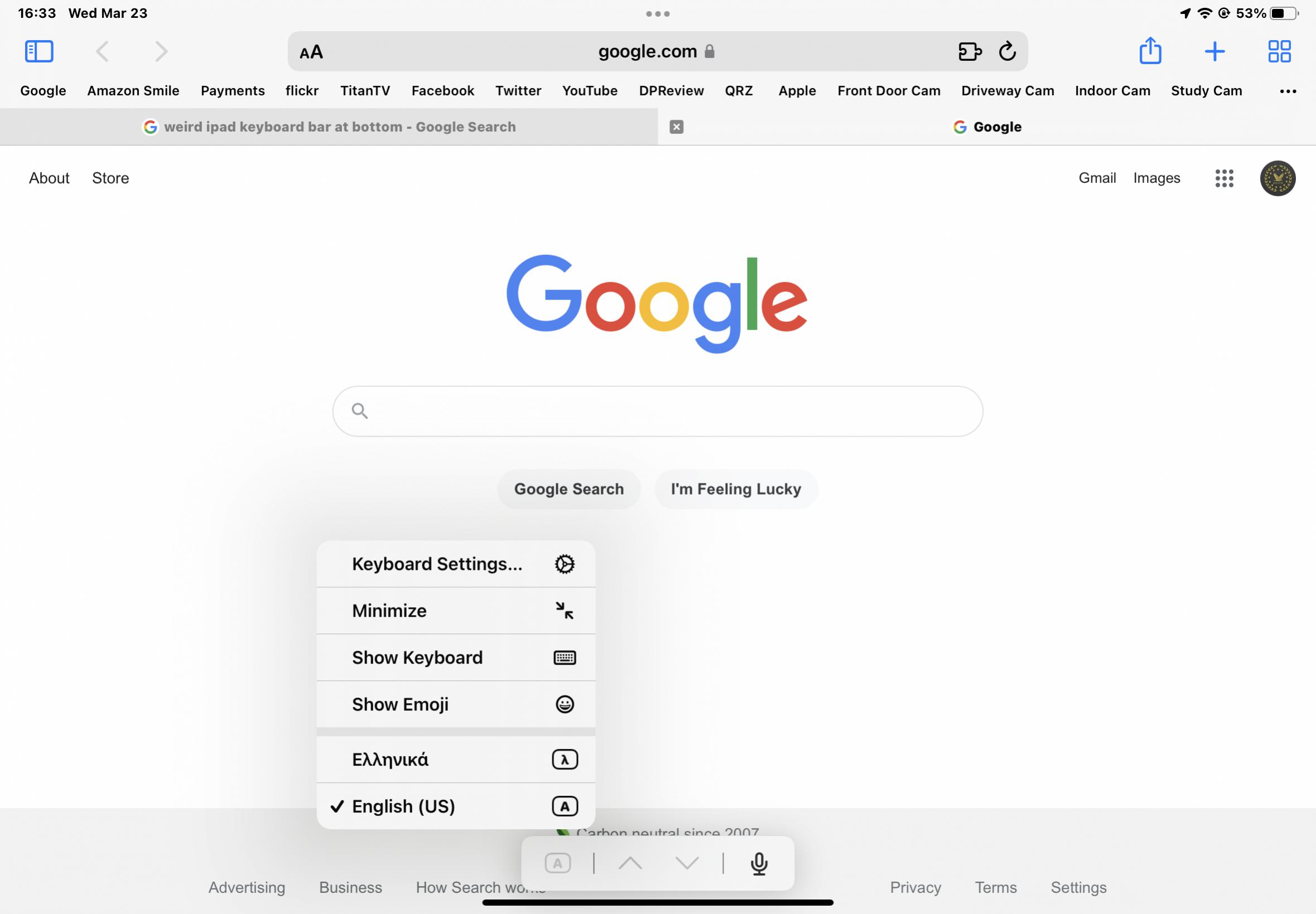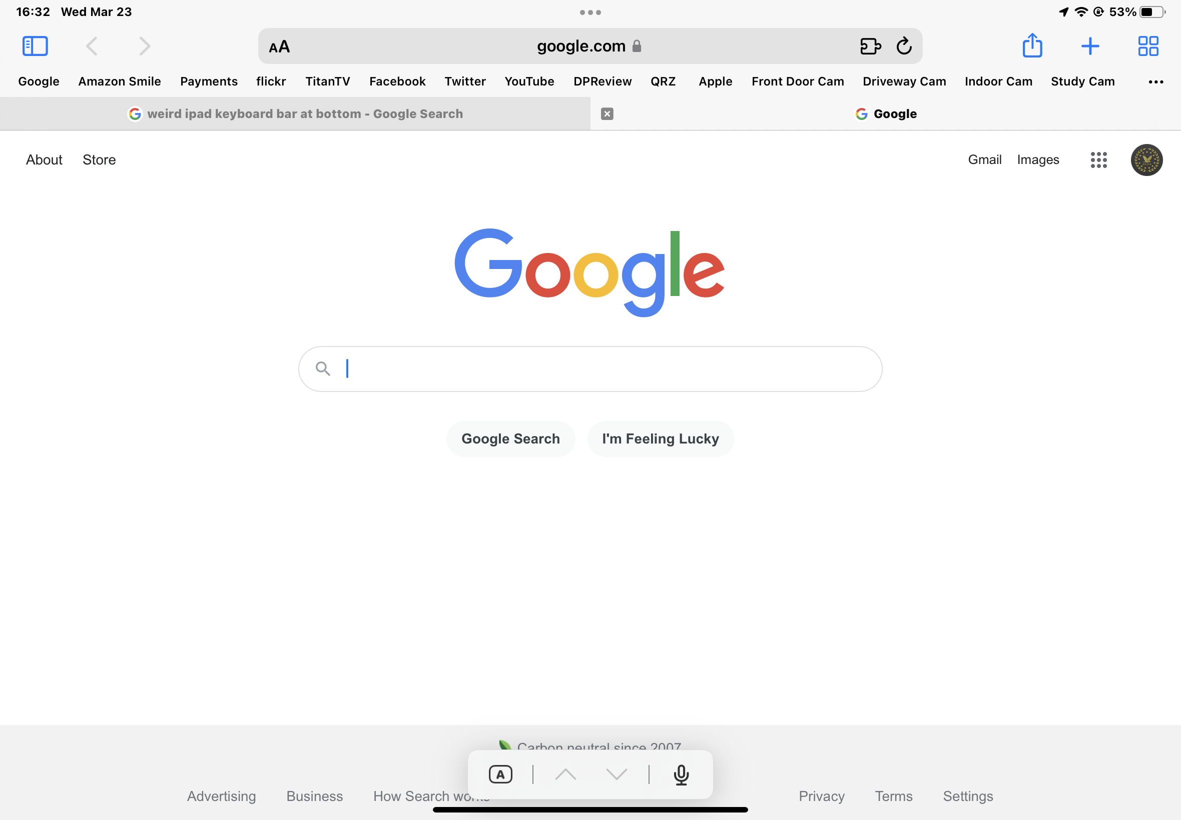 Okay, I think I solved the reason why I was/am getting the weird keyboard bar at the bottom of the screen. I have my iPad Air 2020 in a Logitech Folio Touch iPad Keyboard Case with Trackpad and Smart Connector. I almost always have it folded back to use the iPad in tablet mode. It locks into place with a magnet. I opened it up into “laptop mode” a few minutes ago and guess what appeared. Yep, see screen captures! Good news is I’m not hallucinating after all.
