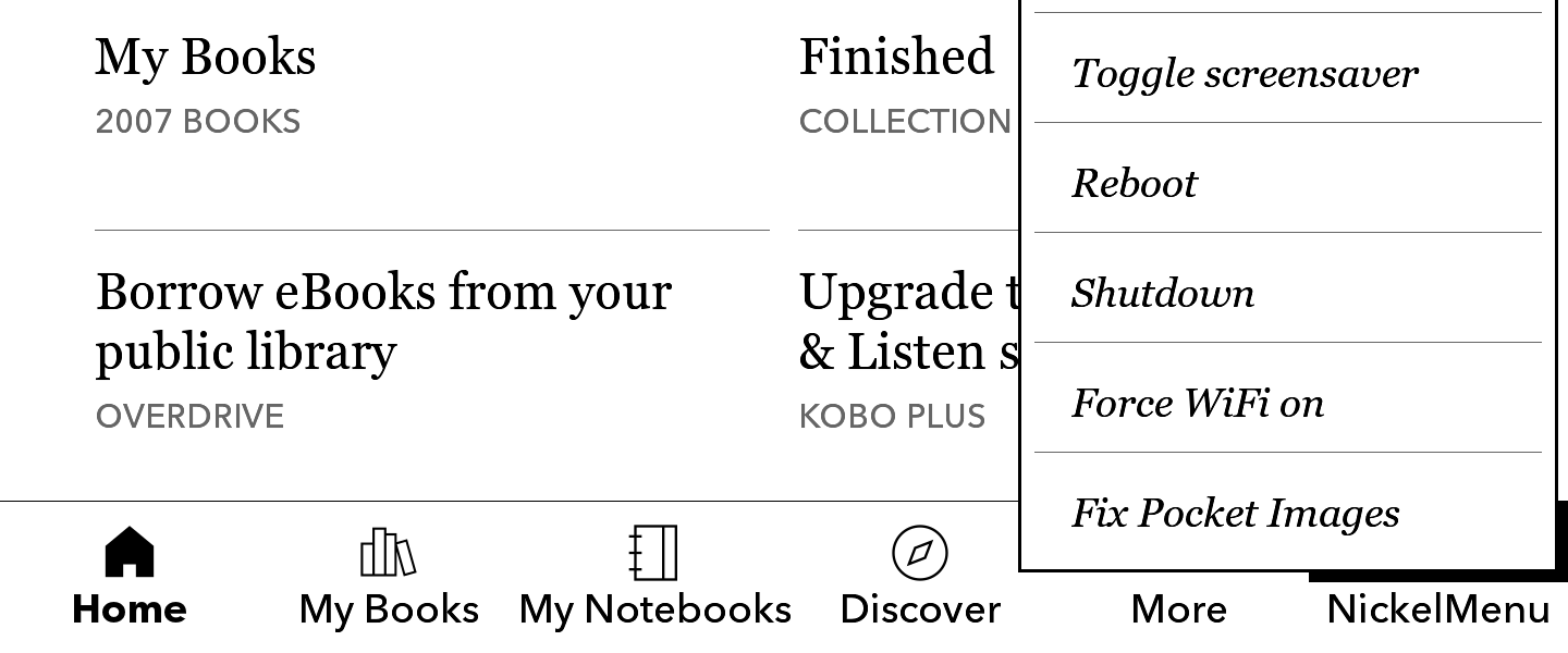 menu_item :main :Fix Pocket Images :cmd_spawn :quiet:/bin/sh /mnt/onboard/.adds/pocket/fix.sh chain_success :dbg_toast :Done # ----------------------------------------------------------------------------------------------------------------------------------------------------------------------------------- # menu_item :library :Fix Pocket Images :cmd_spawn :quiet:/bin/sh /mnt/onboard/.adds/pocket/fix.sh chain_success :dbg_toast :Done # ----------------------------------------------------------------------------------------------------------------------------------------------------------------------------------- # # Then I dragged the pocket directory from the .zip file into the .adds directory on my Kobo ereader. When I opened NickelMenu, I saw the Fix Pocket Images directory and when I tapped on it, I got the Done toast. Sadly, I don't use Pocket but don't think that should have any effect on the test. When I look at the .adds directory, I see the nm directory and the pocket directory. In the pocket directory, I see the fix.sh and magick files and the fonts and lib directories. Last edited by DNSB; 05-29-2023 at 10:38 PM. |