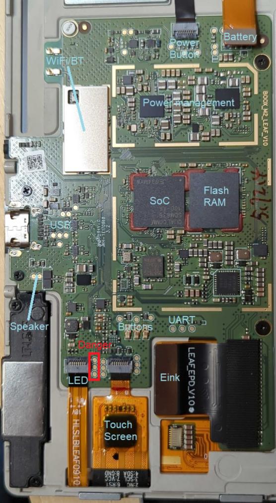 I can identify many of the test points, but I don't see anything unless it's close to the battery connector. This is a shot of my Poke3 (same SDM636) to show you how obvious they made it. The glass reed switch is my addition. The UART is on the (also added) white connector. You can try disconnecting the battery and reconnecting, see if anything changes. That's on a "mezzanine" connector. You can pull it with your fingernails on each side (knuckles against the board). Pull evenly on both sides. While the battery is disconnected, you might look under the Eink panel connector. Manufacturers try to be sneaky sometimes. It's a mezzanine connector too. If your device WAS working it would be easy to find the EDL points. Since it's the same SDM636 I know that it's GPIO57 and even have a program for detecting it. I think that you have to get a resistor or two. Got any neighbors? If you had a 1000 ohm and a 1.5V battery you could just test all the points. P.S. If you look under that Eink flex don't bend it too much. P.P.S. You're really, really sure that holding one of the buttons while resetting doesn't get you to fastboot? My Poke3 doesn't have any buttons. Last edited by Renate; 01-28-2023 at 08:58 PM. |