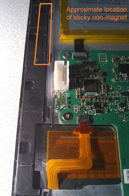 I'm puzzled by it. Neither the cover nor the Poke3 seems to have the least magnetic affinity. I thought for a while that maybe the "sticky rectangle" on the cover was activating the edge of the capacitive sensing on the screen. I have taken apart my Poke3 and I don't see anything on the PCB. I didn't take up the PCB, but I'm still puzzled. I'm thinking some kind of RF sensor, although a real Hall sensor would be lower power. I dunno. |
