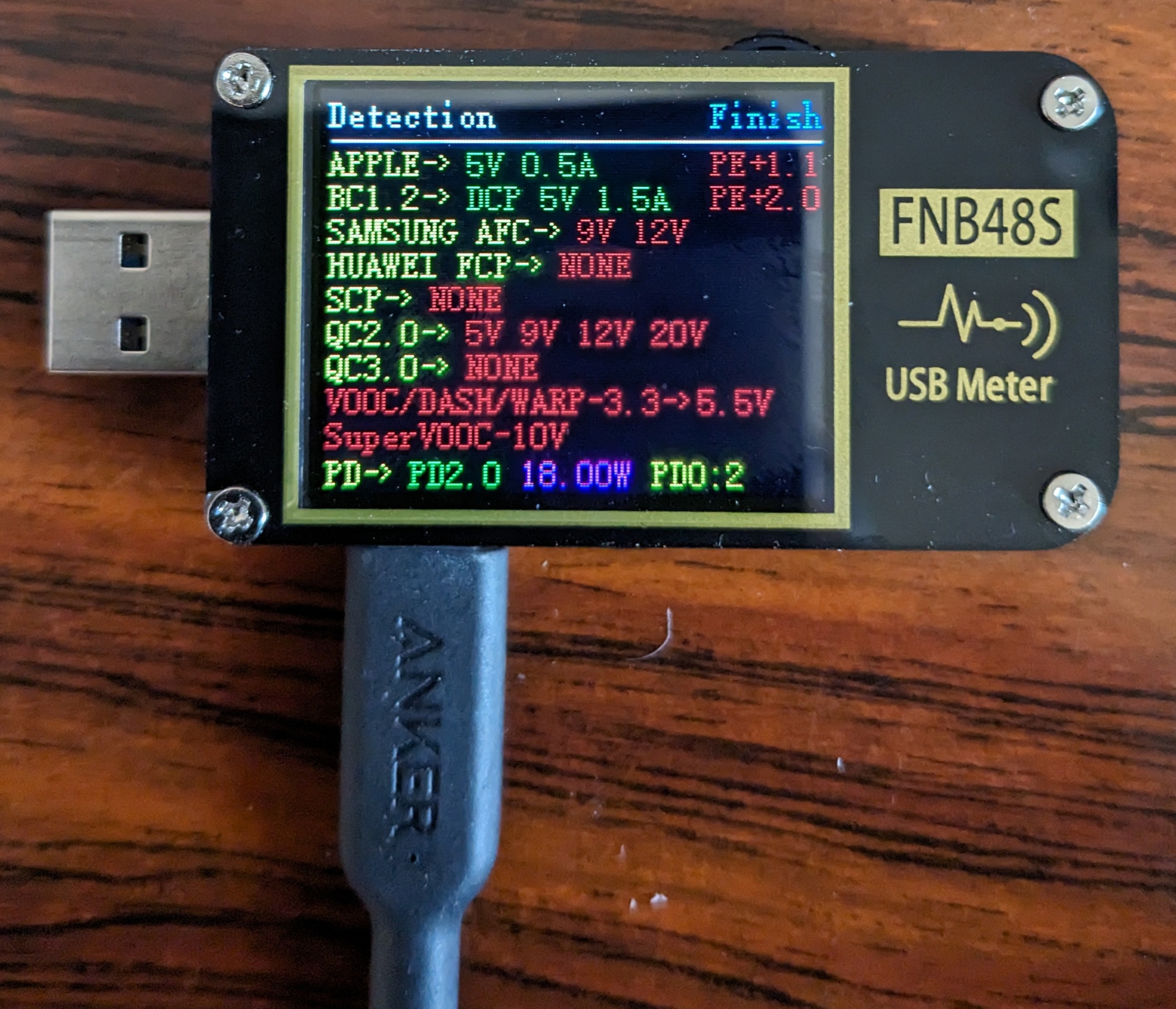 Quick Charge requires both the power supply and the device being charged to support it, otherwise charging falls back to the standard USB ten watts (though I thought 7.5W was the standard, which is what the faster Kobo charging uses). Quick Charge 2.0 (2014) Class A: 5 V (15W), 9 V (18W), 12 V (18W). That matches the charger. The standard USB-C faster charging has no 12V. So now we know how it uses a regular USB-A plug and socket without USB 3.0 connections. The charger should be OK to charge ordinary 5V gadgets. I'd used it with my Kobo Sage before I realised it had 9V and 12V, because most USB-A sockets are 5V only! The USB OTG adaptor with USB-C charging port should in theory support USB-C 20V. I'd need an inline USB-A measurement to see if the fast charge mode works. It certainly charges. |