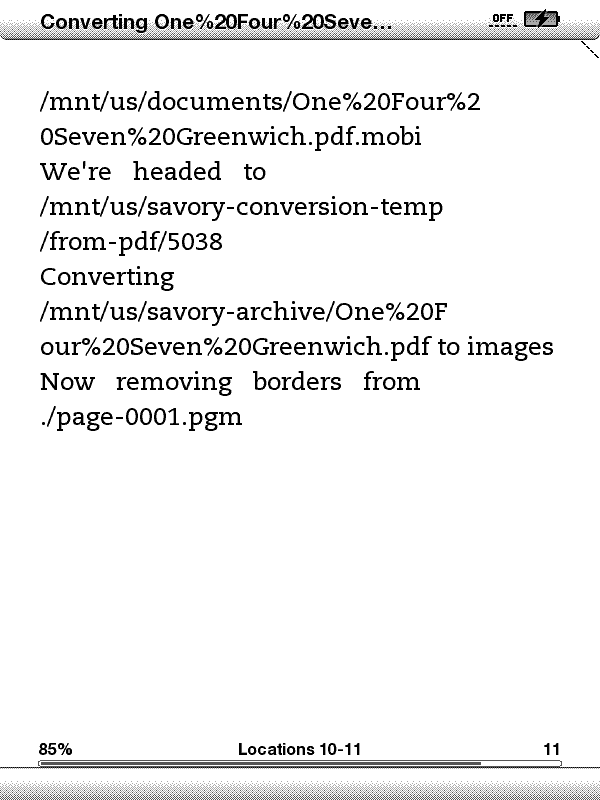 I added a pdf script that I've been using as a sample with PDFRead with some success in landscape mode. I added the file to my "documents" folder and also downloaded it via the browser. I realized I have confused my results by having 2 copies of the same file on my Kindle. Its hard to tell which is doing what. Here is what I think is happening. - The file I added via USB showed up on my home screen with author listed as "User Windows..." (can't see the whole name). This file split into 2 versions. One with the correct title and one with percent (%) signs where the spaces should be between words. Both of these files lost their formatting. - The file I downloaded via the browser also split into 2 files. Both had percent (%) signs where the spaces should be between words. One of those files has the word "Converting" in front of it. Can't see an author name because the titles are too long. The file without "Converting" in front of the title, looks perfect. All the formatting is intact. The files *with* "Converting" in front of the title, is full of conversion instructions and a list of all the page numbers. If I haven't confused myself too much with the double files, I think it's better to download the file via the browser than to add it to the Kindle via USB. A few things I noticed with the file that converted properly: - I was unable to bookmark any pages - Moving the joystick just causes the top info bar on the screen to blink - Just for fun I tried to see if I could change the font size, the font was disabled and nothing happened. I still have more experimenting to do but so far Savory really rocks!