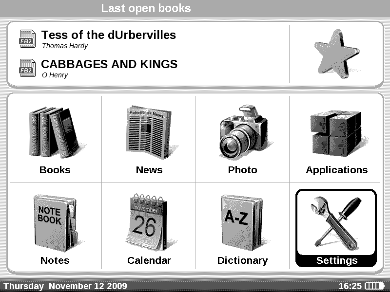 Pix-00.png - This is the main menu. Please notice the names of two most recently opened books.