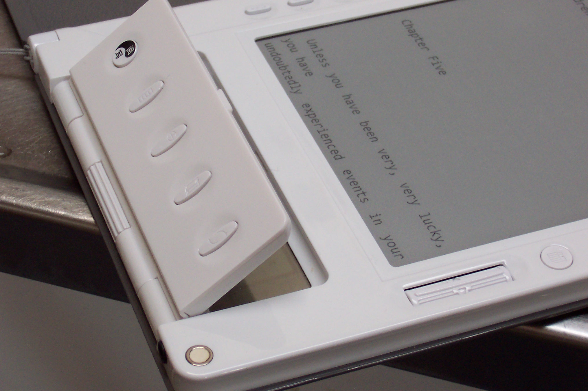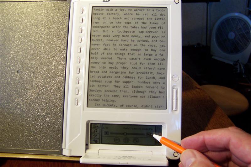 The Hanlin V8 (with not yet integrated) bookstand. Take the cover as base and something between to keep the screen upright. Use button 8 for the next page. |