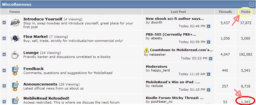 From the attached picture above, I know that an "access-restricted" forum indicates their post count (green circled) on the Forums page in the Miscellaneous Section and see that 1,267 posts (red circled) can be attributed to that MobileRead Reloaded! forum. As a result, of the 10802 "offset", that means that 9535 Posts (10802-1267) can be attributed to the Moderators Section (wherever that is located). Deleted and soft-deleted posts excepted. Isn't there a summary of the total Threads and Posts like the other forums? Last edited by nrapallo; 07-14-2010 at 05:08 PM. Reason: "offset" typo |