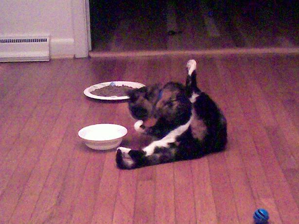 I have another picture of Marbles "drinking" water. she dips her paw in the bowl and licks the water off, and a lot of times she does like here - positions herself as if she is going to clean herself, and then uses her paw to drink. weird but very nice kitty. |
