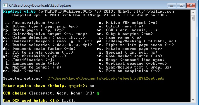 without wanting to promote myself: you could try my windows GUI (see my post above). Just start the program, enter the path to your k2pdfopt.exe, go to the OCR-Tab, check "Enable OCR", select "Tessaract" from the Dropdown menu, click on the "Get language file button" to download the correct file for your language. extract this file to a directory of your choice and enter this directory into the "Tessaract language file directory"-textbox (make sure to check this option too). then you just need to drag/drop your pdf files to the files list and click start. it will set the correct environment variable itself (needs administrator rights) and convert your files. best regards Jens PS: Just asking around: In the past I have deliberatly not included any online functionality into my GUI as to not scare anyone. The thing is, it could really help a ton. I could update commands pretty much on the fly, could download tessaract files automatically, extract them and set the correct folder and the like. Would you mind the program connecting to the net and would want it to stay "offline" or would you appreciate such functions? Last edited by JensW; 06-10-2013 at 01:44 PM. |
