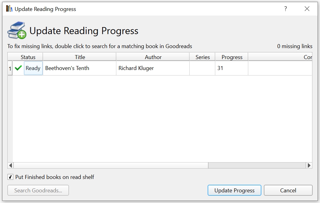 https://www.goodreads.com/book/show/...thoven-s-tenth I selected the Kindle edition since the Kobo doesn't have a separate GR edition listed. I must have something configured incorrectly, I'm just wondering what. The attached screenshot show what I see. I select "update reading progress" and my GR homepage persists in showing the last update I manually entered there. |