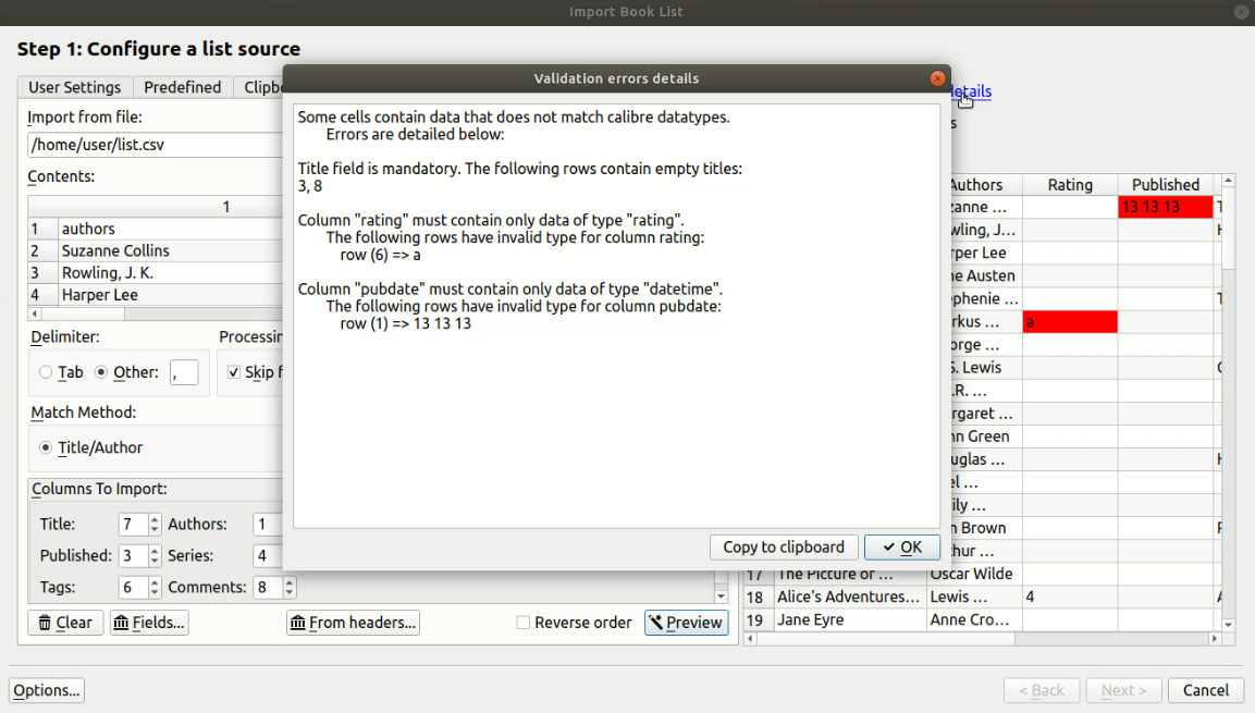 Update: Add a progress dialog. Update: Add datatype validation. Update: Add context menu for exporting to csv. Fix: title/author match not matching books with multiple authors even if identical. Fix: Update predefined sources: Amazon, NY Bestsellers. Fix: Removed dead predefined sources: BookChart, Amazon Listmania, Play.com, SFFJazz, WHSmith Fix: Guess form headers now ignores duplicate headers. Fix: Update universal line mode to use open newline arg. Fix: Remove unused custom series indices headers. Fix: Error when removing and re-adding encodings. Fix: Buttons in encoding dialog now change their state based on selected item. Datatype validation: This feature is added to avoid the problem of the plugin failing midway with an exception because a value was not suitable for a column it was supposed to go (e.g text value for column that only accepts int or float). If you are importing a large dataset this can happen several minutes — or hours — into the import process. Now the datatype validation checks before proceeding, and if errors are found; a validation error message appears offering details. It also highlights errors in the preview table with a red color, and offers a checkbox option to filter the rows with errors, so that you inspect them, and if you want delete them and proceed with the rest of data. Also the new export to csv feature allows you to export the rows containing the errors to a csv file to deal with them later. The only type of validation the plugin used to do before is checking title field, and preventing the user from proceeding if an empty title was found, but without any details of what and where the failure is. The title field check is included in the datatype validation but with details and highlighting. The datatype validation only catches errors that used to stop the import process. This includes int, float, rating, datetime and title fields. Errors that are ignored by the plugin and discarded or replaced by default values are not included in the datatype validation. Examples of these are: illegal language values which are replaced with UNDEFINED by the plugin, and illegal boolean values which are replaced by False, series_index for which invalid values are replaced with 0, ivalid enum types which are discarded by the plugin. There is also a fix for a problem with the original title/author matching of the plugin not being able to match books with multiple authors. It is surprising this has not been reported until now given how long ago this plugin was developed. @Rellwood reported problems with author/title matching without specifying multiple authors being the problem. I don't know if this solves his issues. As with the previous version you are advised to use this only on a test library until you are satisfied it can be used on a daily basis. Last edited by capink; 08-13-2020 at 11:30 AM. Reason: remove link |