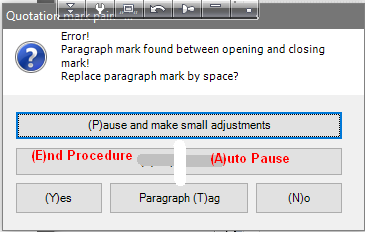 Dialogue-tag1, "Spoken sentence-1. Spoken sentence-2. Narrative-sentence. Dialogue-tag2, "Spoken sentence-3." To fix the error 'all' one needs to to is to insert a closing quote at the end of Spoken sentence-2. In addition, quite often Spoken sentence-3 is a response from a different speaker to Spoken sentence-1 & 2, which usually means a newline must be inserted -- either before Narrative-Sentence or before Dialogue-tag2 - or maybe both. We have another way of tackling these books. A repetitive search for [“"]*["”] will highlight text between an opening and closing quote; of course, it highlights all dialogue, both properly and improperly formed. But where there are lots of errors of this sort its actually faster to use it, because it can be driven from entirely from the keyboard. Whereas within the dialogue checker, after pressing/clicking 'P', I have to use the mouse to put the insertion point within the highlighted text, then use the keyboard to correct the text, and then the mouse again to get back to the procedure. Ideally I'd prefer not have to use the mouse to position the insertion point. and return to the procedure - i.e. a mouse-free process. Maybe that's not possible within the context of a Word addin. If that's true then even if this suggestion were implemented I wouldn't be satisfied, so I'm questioning its merit -- seemed a good idea at the time ![]() I fell into the trap of specifying a solution rather than stating requirements ![]() BR |
