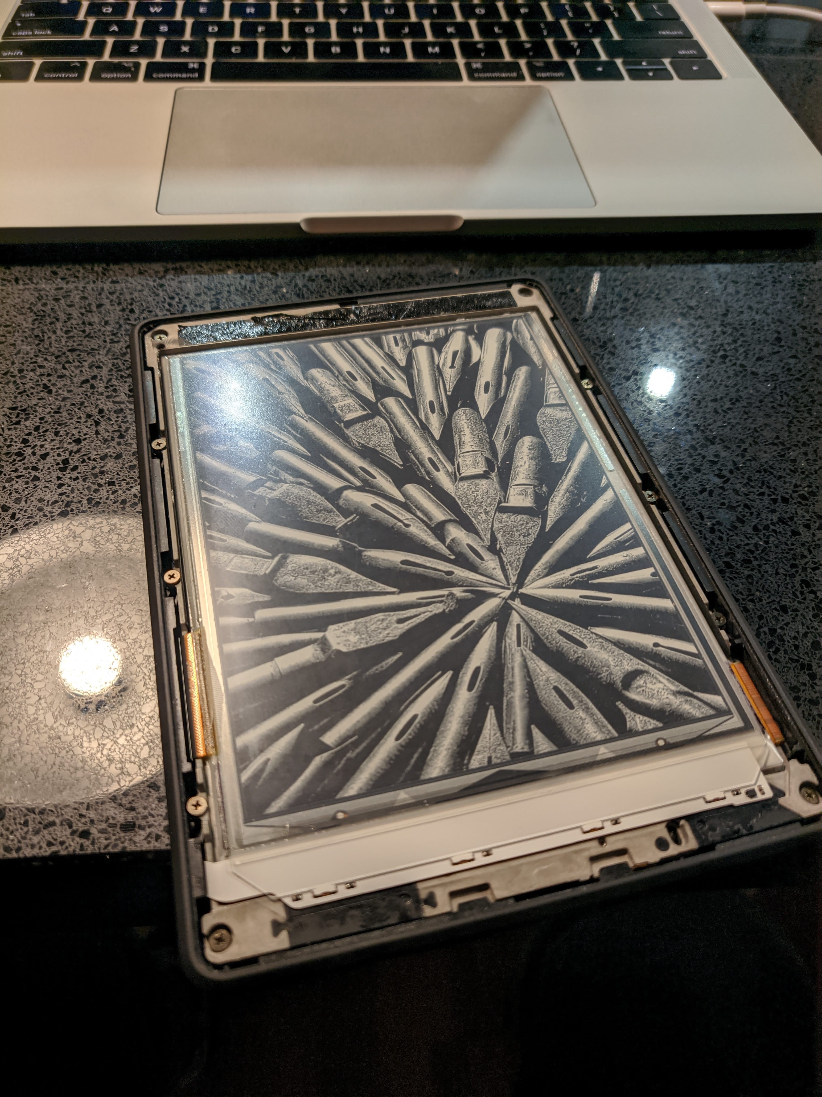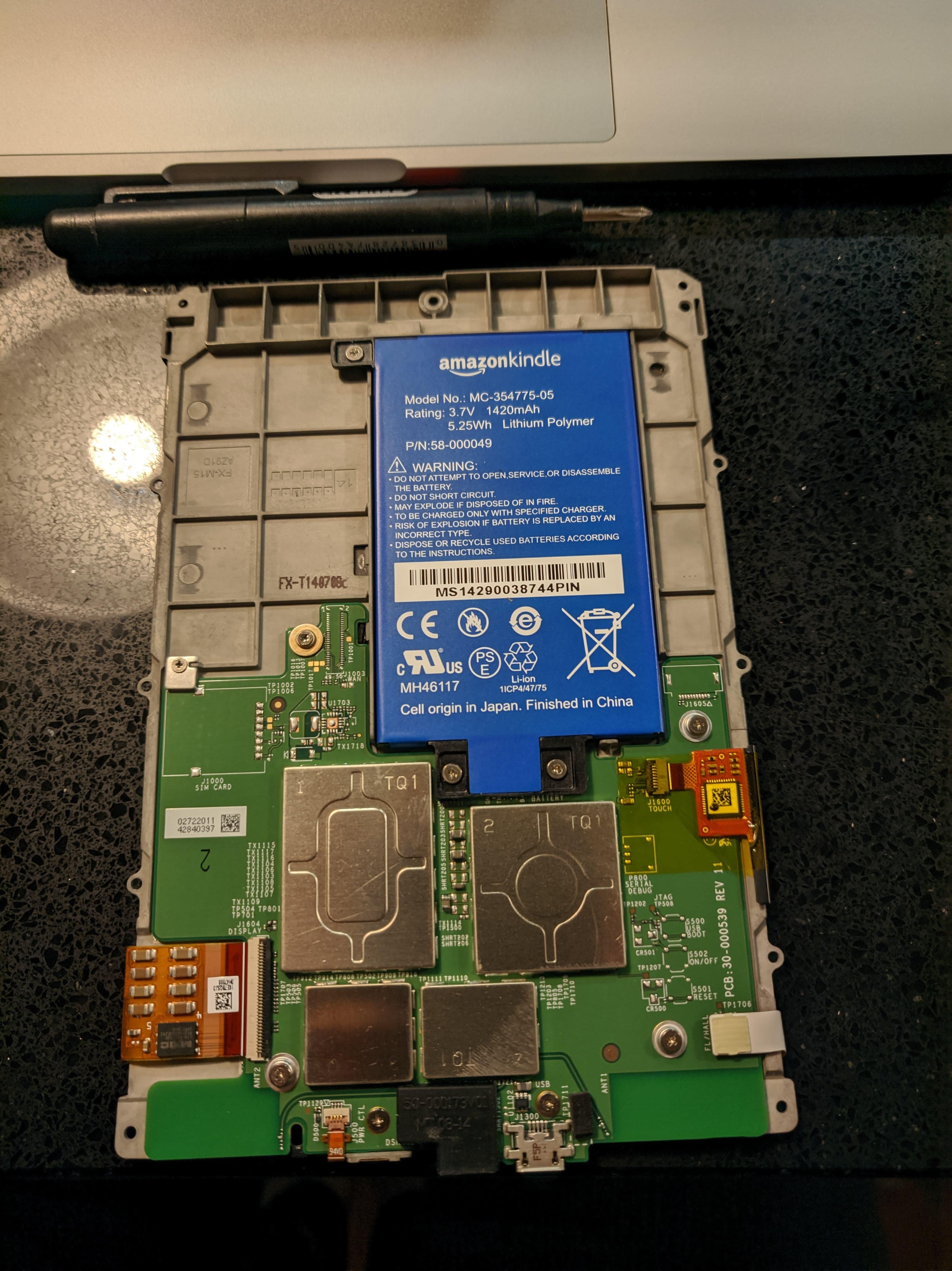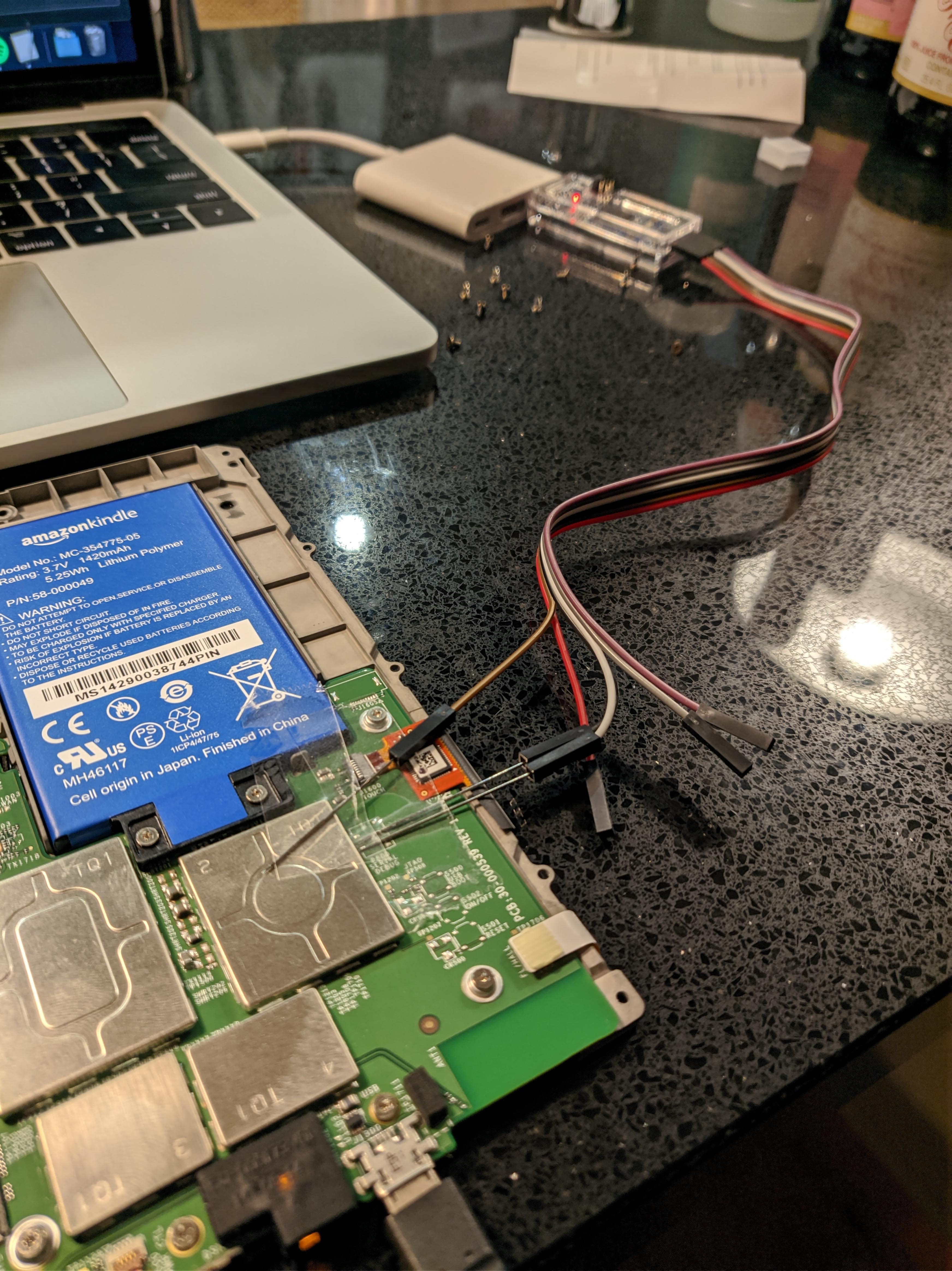 I connected the RX and TX to the TX and RX on the kindle by inserting a sewing needle into the dupont cables provided by the adapter and taping them to the board. I also taped the GND to the metal plate.