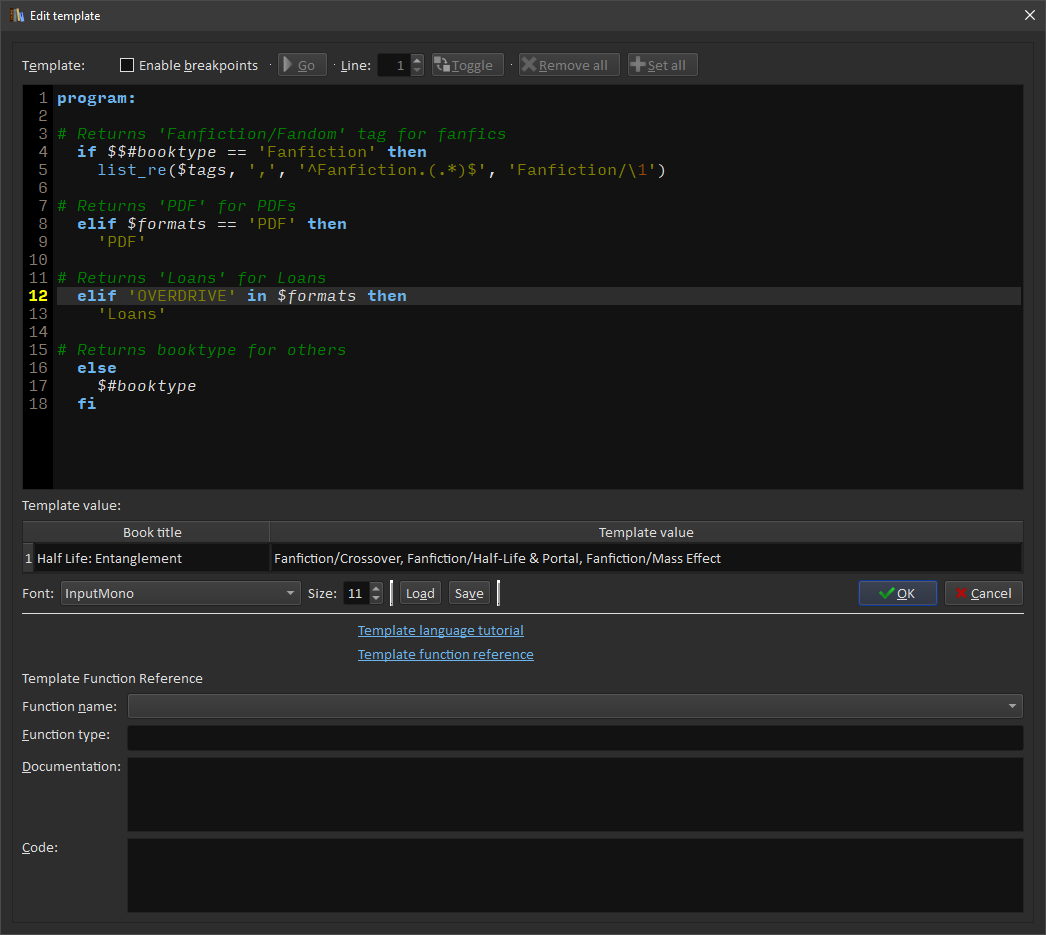 program: if $#kobostatus then # Returns 'Fanfiction/Fandom' tag for fanfics if $$#booktype == 'Fanfiction' then list_re($tags, ',', '^Fanfiction.(.*)$', 'Fanfiction/\1') # Returns 'PDF' for PDFs elif $formats == 'PDF' then 'PDF' # Returns 'Loans' for Loans elif 'OVERDRIVE' in $formats then 'Loans' # Returns booktype for others else $#booktype fi fi Due to my tagging practices: a) Fanfiction.Crossover is the always the first in the list; a) I only have multiple tags when one is 'Fanfiction.Crossover' b) I always prefer 'Crossover' for the first pick. So based on this, I thought of two separate solutions: Option #1: splitting the list: Code: