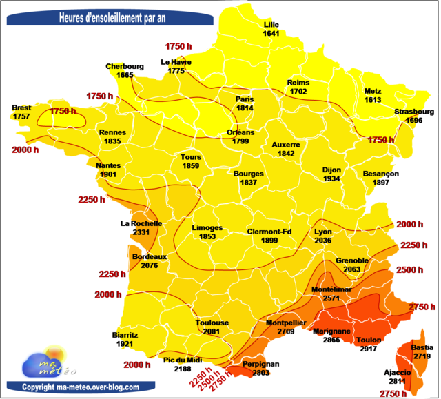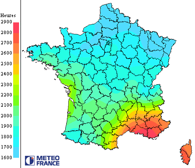 i've found some maps of sunshine in france. the first one is annual totals from 1961-1990. i suspect things have changed since then. it's on the site of Météo-France, the french meteorology bureau. they give some further info : one year of complete sunshine = 4380 hours. so 1600 h = 36%, 2200 h = 50%, 2800 h= 64%.