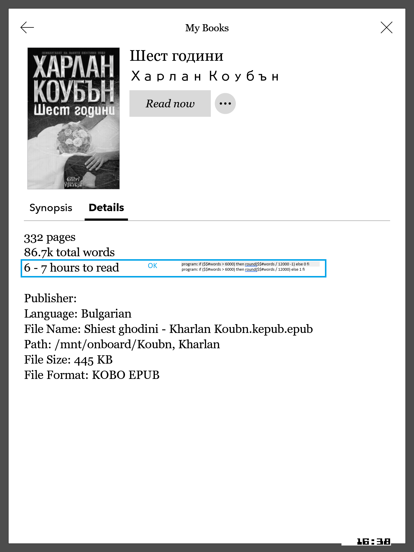 On the first 3,i'm using the following templates: program: round($$#words / 12000 - 1) program: round($$#words / 12000) The results for reading time on those 3 screenshots are correct. They match the data on the sites and are realistic. On the next 4 screenshots,i'm using the following templates: program:if ($$#words > 6000) then round(($$#words / 12000) - 1) else 0 fi program: if ($$#words > 6000) then round($$#words / 12000) else 1 fi Here, the results are very contradictory - some are OK, others are totally wrong. And I can't understand why. By the way, the values of the estimates sent to Kobo are in hours, not minutes. Judging by all the screenshots and results, the data being sent to Kobo, is directly in hours. That's why in the templates, i'm experimenting with 1 and 0. Cheers! Last edited by Svens; 05-09-2022 at 04:28 AM. |