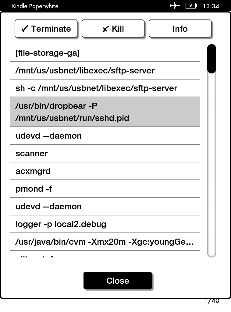 .Unfortunately, that model's has been supported for a few days now, so you mist be doing something wrong somewhere... .@Aeris: I see an SSHD, which, yeah, of course is running, it's a daemon, that's the job .And I see a bunch of sftp processes, which probably means that something is handling sftp like crap on your end of things .Check with htop in tree mode (or ps faux) to see what's hogging the sftp subsystem. That, and define 'closed', because without some context it doesn't mean much .