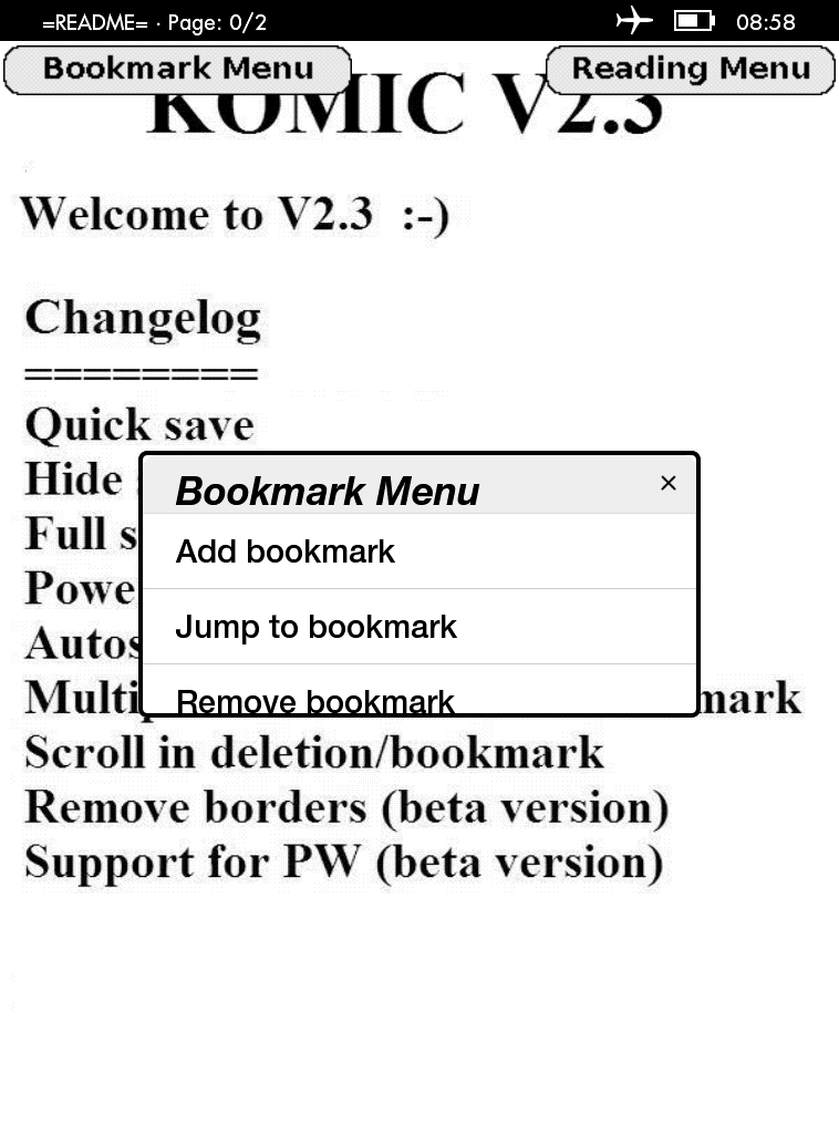 I updated on 5.3.4, it launchs fine (thanks knc1). So here is my feedback : -I made screenshots (the first ones) to show you few size issues (menus too shorts, and bottom text in settings a little too big ![]() -(sound option is useless on pw, because there is no sound at all) I did not use the readingJS you send. I used the original one, the taps I make on the screen are not read as taps by komic but as scroll (up and down). (scroll in the 7 screenshot) What is I think happening : -When I tap, it sees a scroll and then scroll for about 1mm or less (up and down scroll). -You need to tap a lot to change the page/access the menu. Solution that I can think of : -disable up/down scroll : I resize all my comics to 758x1024 this way they are fullscreen and I only need to zoom if the font are too small but the screen is usually big enough. OR -increase the scroll detection press time to detect taps quicker and scroll longer. The deletion works fine. I did not try the other scripts (remove borders and decompress cbr/cbz, I think they work just fine because they don't depend on GUI). I hope it will help you correct some issues. I will continue testing (try the readingJS for example and use the other scripts). |