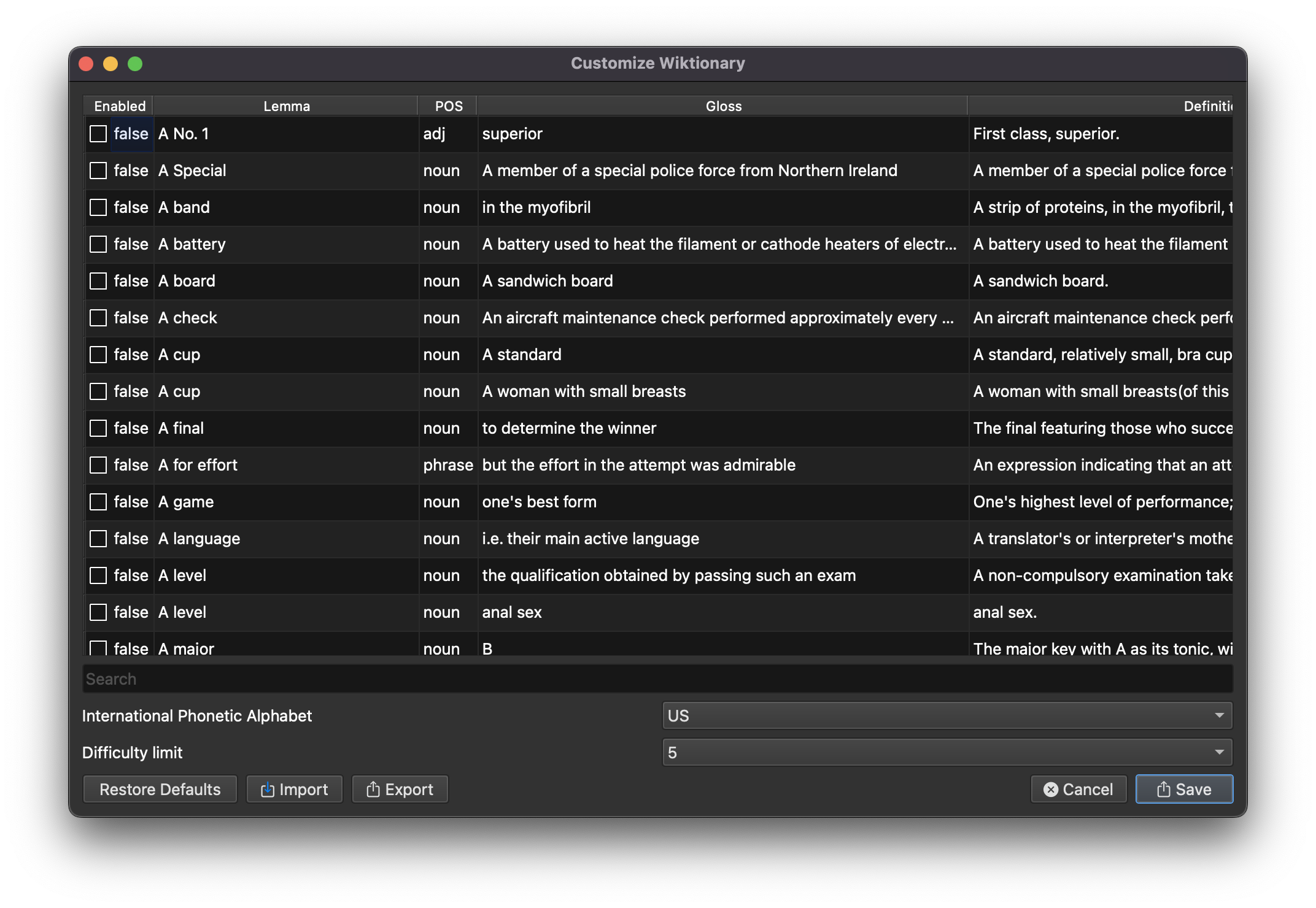 That's for Kindle books, you need to click the "Customize EPUB Wiktionary" button. In this window, you can set the difficulty limit to 1.