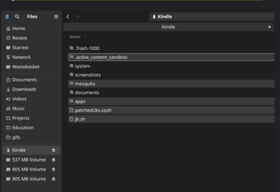 All the files from the WinterBreak.tar.gz were extracted to the internal storage folder of my kindle. I tried re-copying them several times with no success. Factory reset, extracted again, still not working after following all the steps. Not sure what else to do. The only thing I noticed, and I’m not sure how much this matters, is that there was no button to “eject” my kindle in the file explorer when right clicking. Tried different ports and cables, nothing. Safe eject should be automatically applied to my USB ports though.