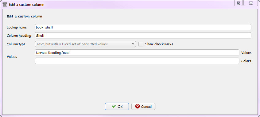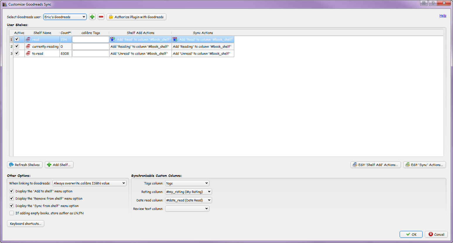 Here are screen shots of my custom column, and how I am populating it within the Goodreads Sync customize. Note: I only use the standard Goodreads shelves, so I am using a Text column with set values. You can change this to be any other text type if you use others, or just add the extra values you need to the set values of the column. I find using the set values makes it easier to capture when a book is moved to a different shelf. I have also including a screen shot of my Date Read and My Rating custom columns. I hope this is helpful. |