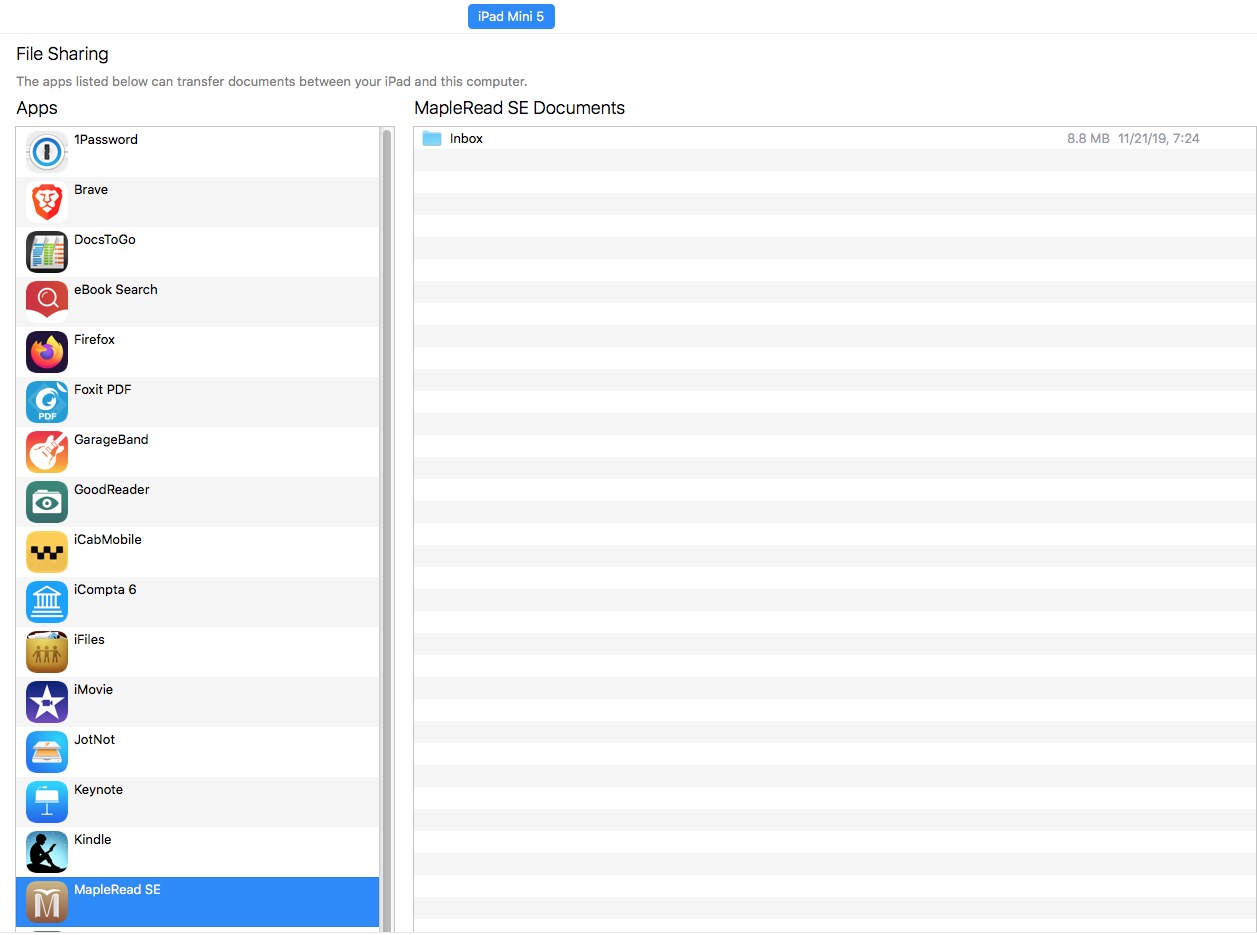 iMac: Mac OS 10.13.6 with iTunes 12.6.5.3 I'm trying to do this but when I go to File Sharing in iTunes and select the app all I see is a folder labeled "Inbox": Where am I supposed to see the backup files to move to the iMac? The "Help" item in the drop-down menu of the Export icon in the iTunes tab of MapleRead SE says files that start with "MR_Backup" are ignored but when I tap the "Backup" item in the menu, I'm told they will be in a folder labeled "MR_Backup"! I went back and found that the procedure worked for my iPads when they had iOS 12.x on them so it seems the problem is with iOS 13.x. So it looks like the backup procedure in the FAQ no longer works with the latest version of iOS, and I'm now SOL backing up via ITFS. I went and checked the "Files" app on my iPad Mini 5 and while there IS a folder in it labeled "MapleRead SE", it is empty. Last edited by issybird; 02-20-2020 at 07:26 AM. Reason: Oversized image thumbnailed. |