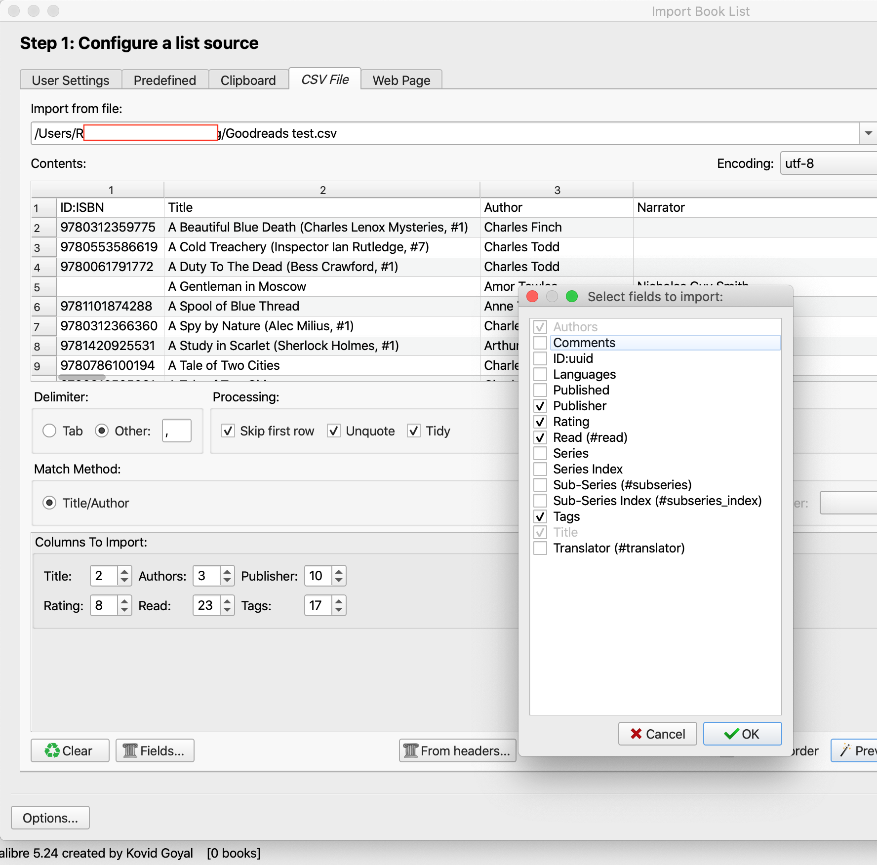Background: I'm trying to import a large number of "empty" books using data from Goodreads (ultimately to shift whole catalog management from GR to Calibre). I've created an empty library to use as a test with the same columns I have in my real library. I exported my GR data and extracted about 200 lines to test with. Saved as a csv file. When I try to match the fields I'm not getting an option to match the ISBN field. I've tried re-naming the column in my csv file to "ID:ISBN" which is what I understand the field should be, but it's still not showing up. (My library column layout does have an ISBN column, but since this is a column from another column, I understand that this is not the field to match to.) I'm sure I've missed a step somewhere, but I can't figure out where! Screenshot attached. Last edited by ZuleikaD; 08-10-2021 at 03:11 PM. Reason: Added screenshot |