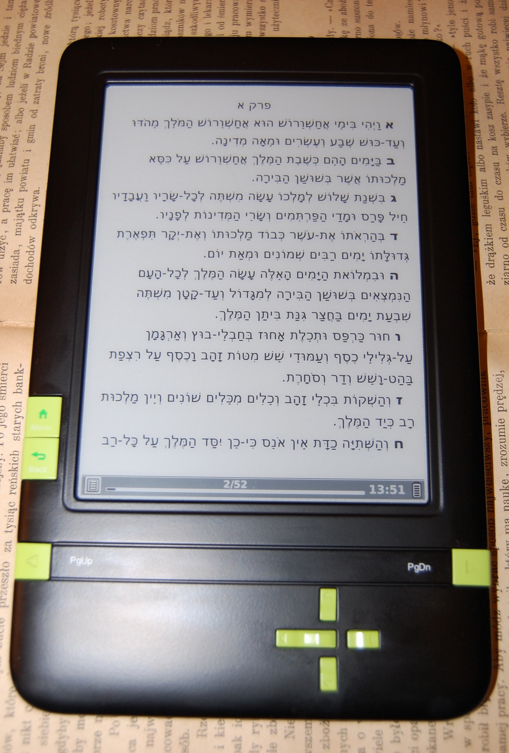 It might be that this reader that is being sold in Israel has a firmware update to enable better Hebrew handling. The following screen captures shows that the erader suppORTS Hebrew properly. Book library is being displayed aligned to the left but the text itself is readable and fine. Book title is being is readable but there is a small problem with some of the text that should be centered and got aligned to the right... Regular text is being displayed properly, including different styles. It's not possible (at least I couldn't find a way) to click on links (for example, for footnotes). Punctuated text is being displayed properly. Just a screen capture to see the device size. I think it's the smallest 6 inch ereader I have ever seen. |