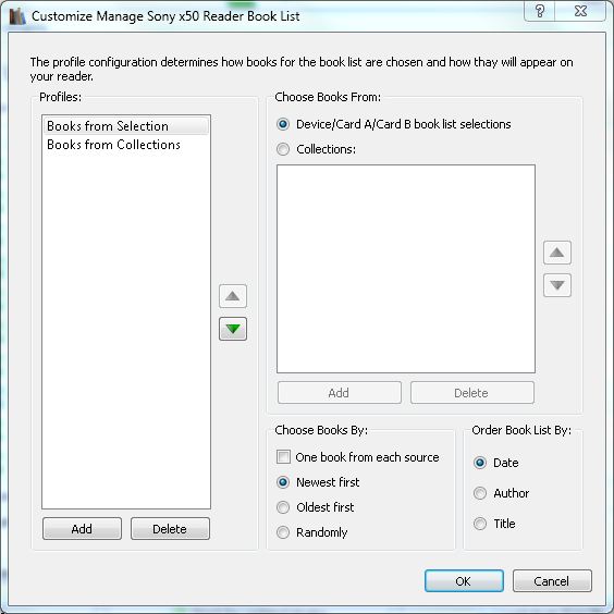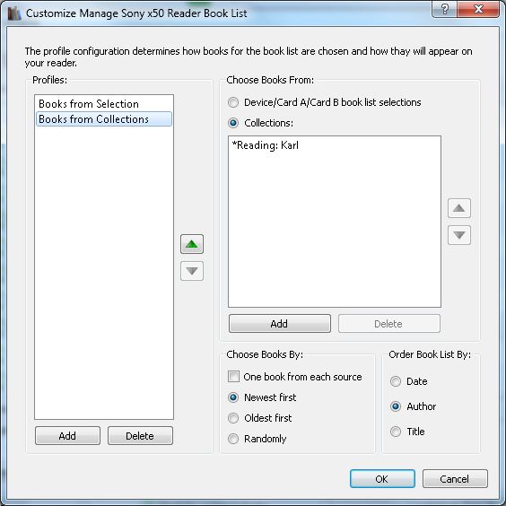 You can configure the plugin up front (and once only) to handle these different scenarios. In the Preferences, you can define multiple profiles. So you can have one profile that is set up to choose books from the device list selection, and another profile set up to choose books from your collection set. I've attached a coupe of images below to demonstrate. Note that you can change the name of a profile to whatever you wish by double-clicking on the profile entry in the listbox. With multiple profiles defined, the action dialog that appears when you run the "Book List" action will present you with a dropbox where you can select which profile you want to use. I think that should address your concern, but please let me know if that's not the case. You may be using the plugin in a different way than I am and I may not be understanding the issue correctly. Thanks for your support! |