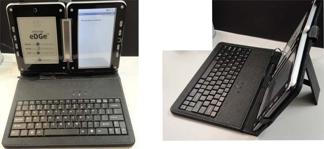 The PE slides in from the top of the folder and there are metal spring clips at the side and the bottom to hold it in place. The USB cable supplied with the folder is too short for the PE but I had a USB extension cable lying around I could use. On the back of the folder there is a prop (like on a picture frame) to hold the PE up while typing (you can see it in the side view picture). It comes with a cheap stylus but I didn’t use it (and it would not work on the reader side anyway). Folder looks pretty cheaply made so I don’t know how long it will last. |