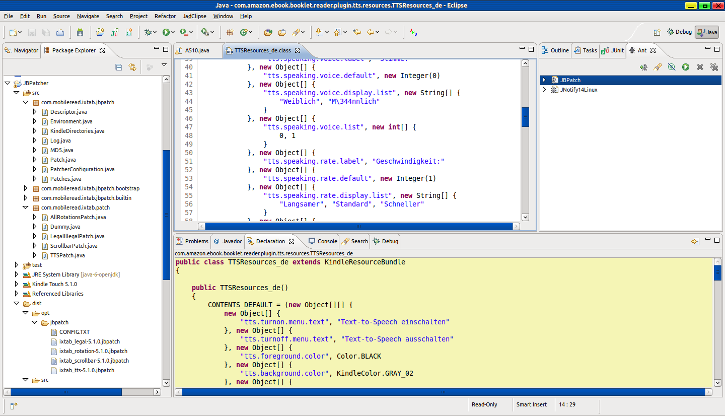 thanks for commenting... at least you're reassuring me that this doesn't go totally unnoticed ![]() Yes, even in this rather simple case, it's unfortunately not as simple as editing some file with a text editor. So first things first, you need to have the development environment ready for this: get a Java Delevopment Kit [JDK] (NOT only a Java Runtime Environment [JRE]) from http://www.oracle.com/technetwork/ja...ads/index.html Since Oracle has bought Sun, the site has become a mess but you should still find your way through.Second, you probably want to get Eclipse, which is an Development Environment for Java. Get it from http://www.eclipse.org/downloads/pac...pers/indigosr2 Third, if you have never used any of these tools, create a "hello world" project for yourself (I'm not kidding), and make sure that you get to compile and run a "Hello World" application. Fourth (... and that is indeed a huge leap from "third"), make sure that you can import the project from git. That involves having git installed in the first place, and cloning and synchronizing to the remote repository from your local installation. The procedure to do so is not complicated, but it really depends on your local configuration, so I can't give any boilerplate instructions here. Fifth , you have to make sure that the JBPatcher project actually has its dependencies satisfied. Essentially, that only means that you must have a "User Library" called "Kindle Touch 5.1.0", which includes all the jar files from the KT5.1.0. If you have a copy of your Kindle's /opt/amazon/ebook/ on your computer (strongly recommended), then that should do. You only have to set up that User Library once. Once you have the JBPatcher project "error-free", you should be able to follow the instructions without any problem, and actually to write your own patches