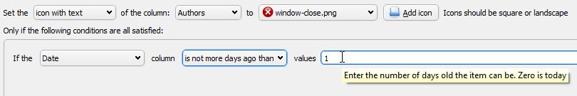 This is what I tried: If the <Release Date> column is not more days ago than <0> - this put the icon in every single row including the ones that the Release Date column is blank and the one that says 2 Apr 2013 If the <shelves> column has value <to-be-release> If the <Release Date> column is not more days ago than value <0> - this put the icon in every row that had to-be-release in the shelves column including one that says 2 Apr 2013 If the <shelves> column has value <to-be-release> If the <Release Date> column is not more days ago than value <1> - this put the icon in every row that had to-be-release in the shelves column including one that says 2 Apr 2013 Am I doing something wrong? |