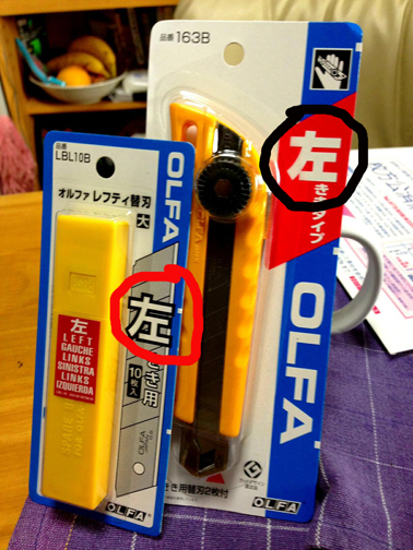 I was walking through the home center this afternoon, and what do I spy? OLFA is now making Left-handed box cutters and even left handed replacement blades. I had to buy it to try.