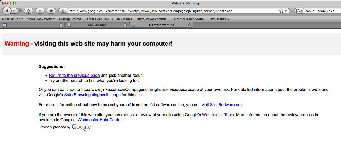 Well, I've just visited the Jinke website (http://www.jinke.com.cn/Compagesql/E...ice/update.asp) and again google signals it as a "reported attack site". At least is what my firefox says...