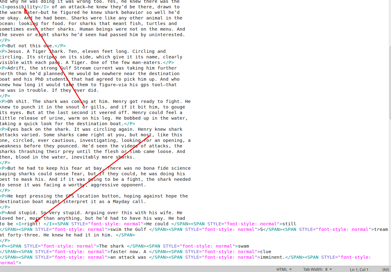 I've been composing in the "Text Body" style in LibreOffice. And from there I've saved the document as an .odt file and then saved the .odt file as a .html file (all in LO). I did it that way for eight stories and it worked perfectly. Just clean <p>paragraphs</p>. I was thrilled. Until this last story.