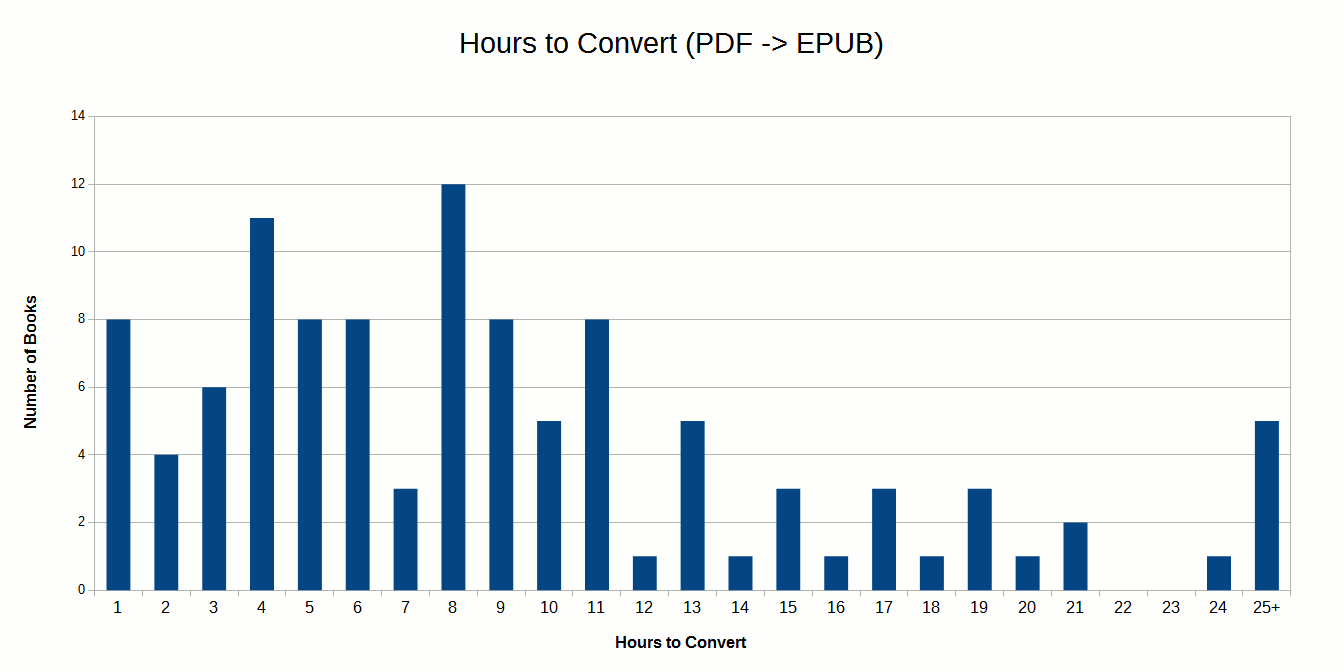As I mentioned, it used to take me two weeks of work to go from PDF -> finished EPUB, now I pump out the typical non-fiction economics book in ~8-15 hours. Side Note: I have a bunch of stats I have been gathering, maybe when I get some more free time I will create a topic on MobileRead showing off the "research". Haven't touched the spreadsheets since March (and still have a ton more info to add to it). Here is a preview of the Hours to convert + word count of books since I started keeping in-depth track of my hours (~October 2012): and here is the word count of all books I have converted to EPUB: Quote: