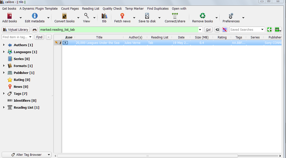 The first capture shows the definition of a Tab reading list. It writes "Tab" to the custom column #readinglist when a book is put on it. Coloring and icon rules will not work unless Reading List writes something to the custom column. The second capture shows the icon rule I used, putting your Android image on the Icon columns. I left off the OnDevice because I didn't want to be required to connect. The third capture shows the resulting library, showing the icon. The fourth capture shows the library after asking Reading List to show the Tab list. How is what you are doing different from all of this? Last edited by chaley; 05-19-2014 at 11:15 AM. Reason: Fixed reading list screen capture |