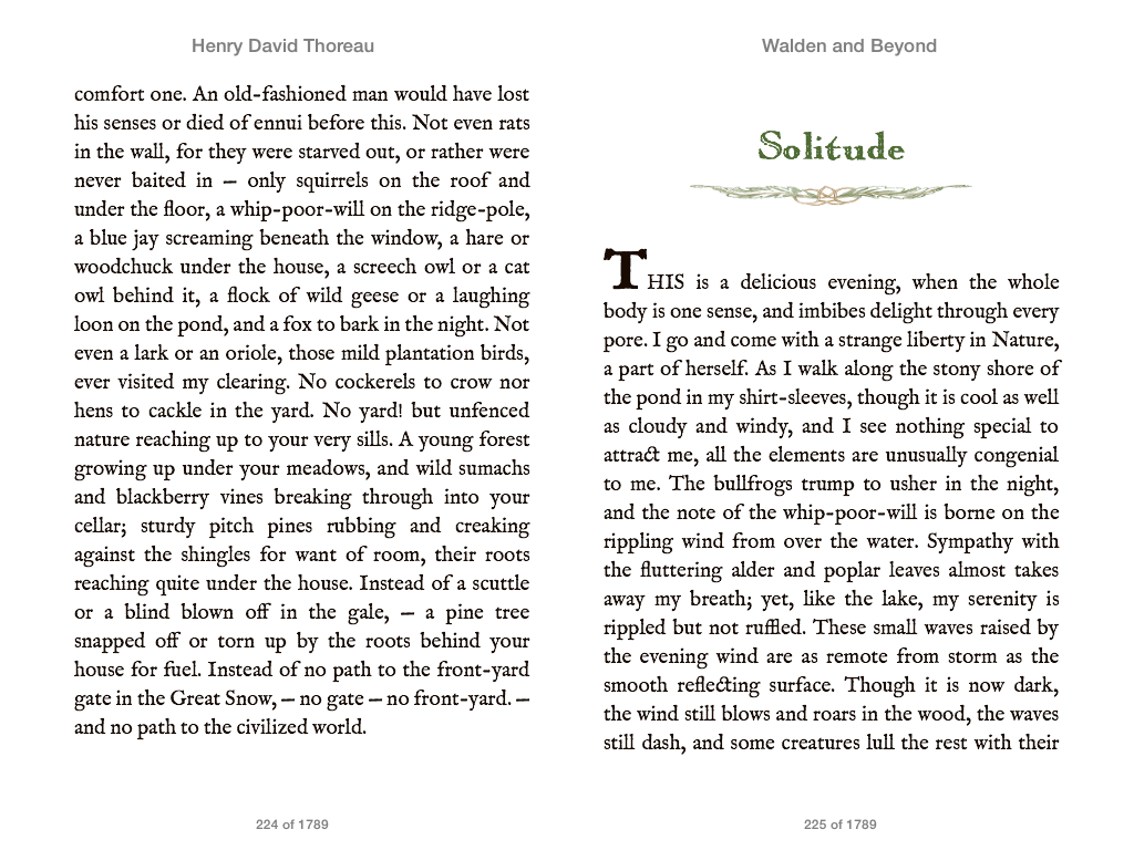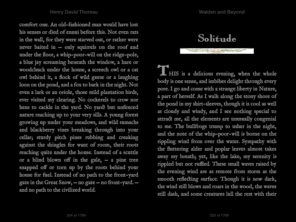 Here's a couple of screenshots of the same page spread as before, one with a white background and one black. You seemed concerned that the green headings wouldn't look okay in the latter, but I think it's just fine -- it does occur to me, though, that I should change my ornaments from JPEGs into transparent GIF or PNG format. Funny, re that latter issue, I don't think I ever tested any of my previous books with a black background, and should probably check the ornaments, etc. that I've used in those, too. I have a few changes/updates I had to make anyway as a result of things I've learned more recently, so I'll just have to add that to the ever-growing list.