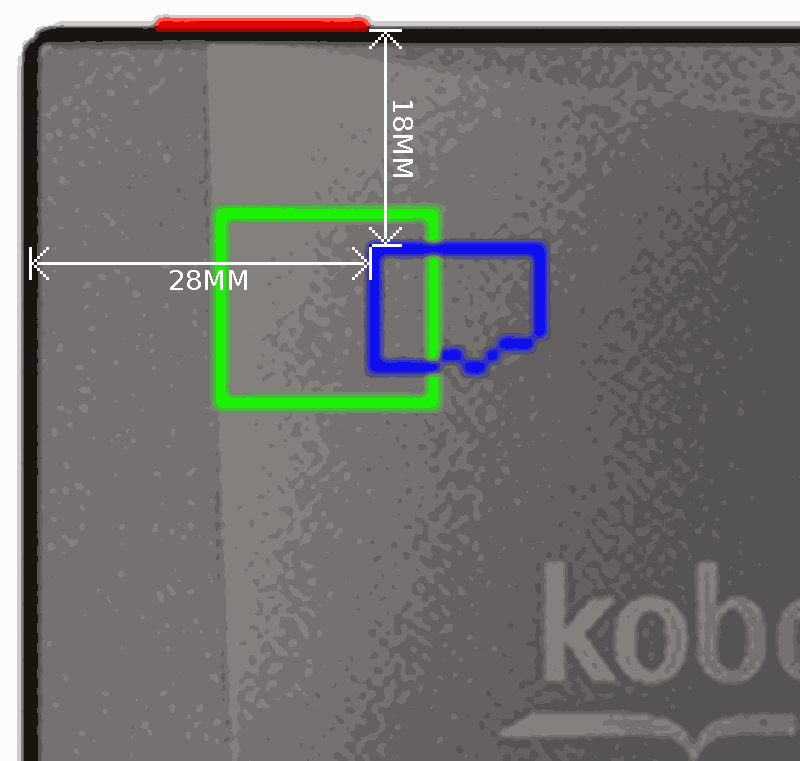 As for the exact position of the SD card... the top left corner of the SD card is 18mm from the top and 28mm from the left, so it's pretty much aligned to the power button, which is 11mm-28mm from the left, so the SD card starts where the power button ends. And the SD card ends where the Kobo logo starts (on the X axis). It does not actually reach into the Kobo logo as the illustration makes it appear, the scale is quite inaccurate, sorry... |