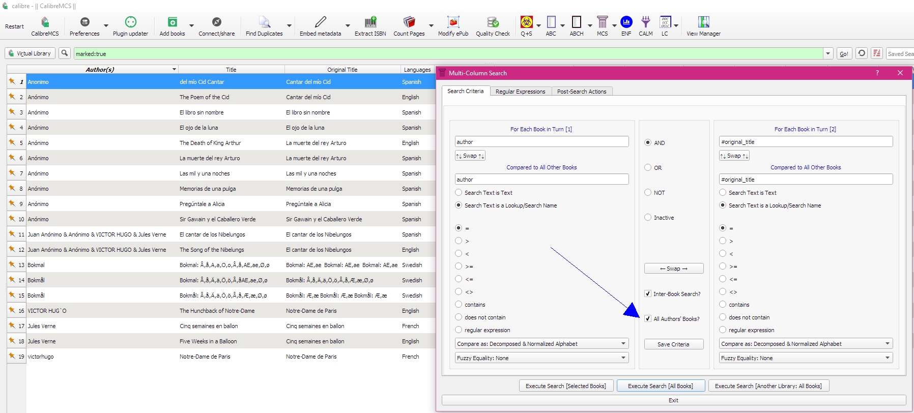 Can I use MCS to find all book titles and author names where the book title contains an author's name from this library? The result should be a list of these books. Examples for a special author Karl May: Title0: Old Shatterhand Authors: Karl May Title1: Karl May Authors: Old Shurehand Title2: Karl May - Winnetou Title3: May, Karl - Winnetou Title4: Karl May - Winnetou 3 - Winnetou's Death Title5: Winnetou 3 - Karl May - Winnetou's Death The result should be a list with titles: Title1: Karl May Title2: Karl May - Winnetou Title3: May, Karl - Winnetou Title4: Karl May - Winnetou 3 - Winnetou's Death Title5: Winnetou 3 - Karl May - Winnetou's Death If possible it would be very nice, if you could outline how to use MCS! |