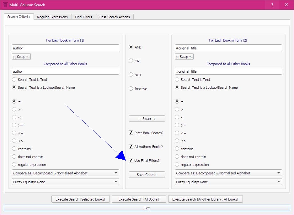 Version 1.0.34 - 11 January 2016 New Search Option: 'Final Filters'. This will apply a maximum of 10 additional filters at the very end to all books that would otherwise have been displayed.