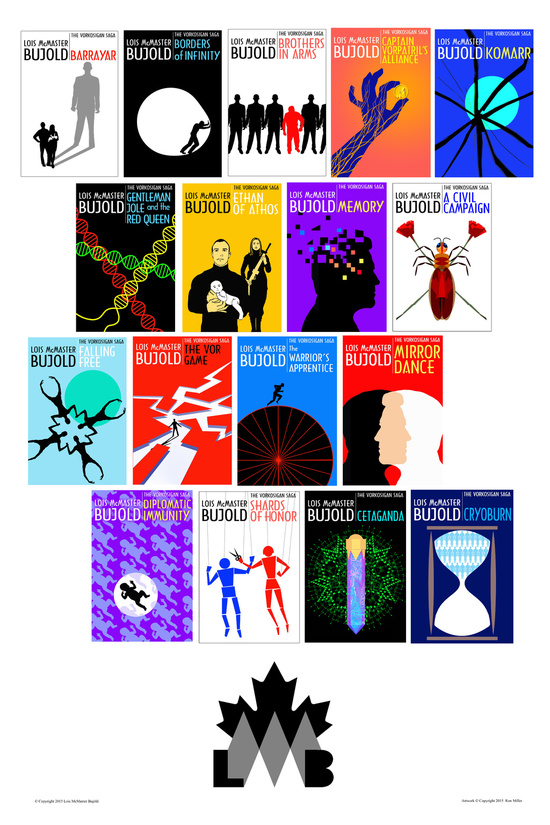 https://www.goodreads.com/author_blo...civil-campaign "There were three tries at this one -- the one chosen was actually the first, which makes me feel a bit guilty. Note the maple leaf on the back of the butterbug." "This was one of the other trials. It amused me deeply, but the realistic style of the wineglass didn't match well with the rest of the set, I thought." "A third entry showed a strand of DNA and two little silhouette figures, one male and one female, chasing each other up/down its ladder, but we already had DNA on two other covers. It was a cool idea that deserves to be recycled someday, though." Ron the artist commented "I didn't care at all for the DNA cover... it was an idea suggested by one of Lois' readers so I thought, why not, let's try it out. But I wasn't happy with it at all. " Last edited by Little.Egret; 11-07-2015 at 08:05 PM. Reason: add another reject |