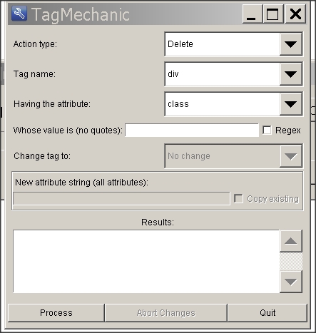 I've already included more tags than I really deem worthwhile to this plugin. The original intent was to be able to change tags/attributes that would be difficult to do with standard Sigil tools or fairly simple S&R (or Sigil clips). Primarily nested tags like spans and divs. For instance, if I wanted to change all h1 tags to h2 tags I'd use something like: Code: