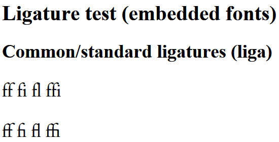<h2 id="sigil_toc_id_1">Common/standard ligatures (liga)</h2> <p>ff fi fl ffi</p> <p class="liga">ff fi fl ffi</p> <h2 id="sigil_toc_id_2">Discretionary ligatures (dlig)<br/></h2> <p>ct sp st ct Th</p> <p class="dlig">ct sp st ct Th</p>  |