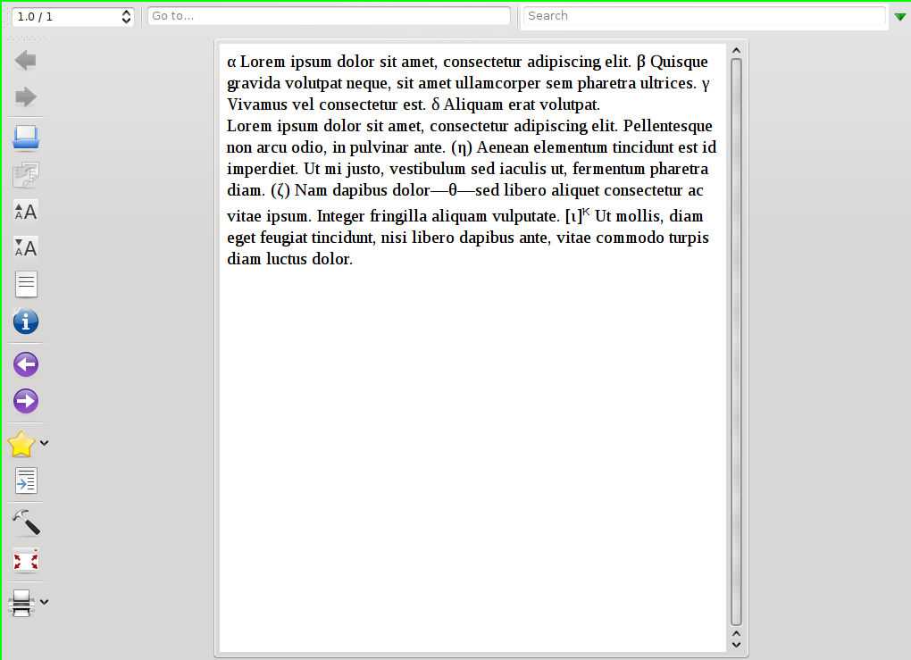 <!DOCTYPE HTML PUBLIC "-//W3C//DTD HTML 4.01//EN" "http://www.w3.org/TR/html4/strict.dtd"> <html lang="en"> <head> <meta http-equiv="Content-Type" content="text/html;charset=ISO-8859-1" /> <title>Calibre Ebook Viewer Tester</title> </head> <body> <p>α Lorem ipsum dolor sit amet, consectetur adipiscing elit. β Quisque gravida volutpat neque, sit amet ullamcorper sem pharetra ultrices. γ Vivamus vel consectetur est. δ Aliquam erat volutpat.</p> <p>Lorem ipsum dolor sit amet, consectetur adipiscing elit. Pellentesque non arcu odio, in pulvinar ante. <span style="font-style: italic;"></span>(η) Aenean elementum tincidunt est id imperdiet. Ut mi justo, vestibulum sed iaculis ut, fermentum pharetra diam. (ζ) Nam dapibus dolor—θ—sed libero aliquet consectetur ac vitae ipsum. Integer fringilla aliquam vulputate. [ι]<sup>κ</sup> Ut mollis, diam eget feugiat tincidunt, nisi libero dapibus ante, vitae commodo turpis diam luctus dolor.</p> </body> </html> Anyway, these two things seem to regularly result in problems for calibre's ebook viewer. Anyway, here's what the HTML file looks like in Firefox (as it should): ![]() However, take the same file, put into calibre, and convert it to an ePub. (I'm using whatever the default settings are.) Then View Specific Format > ePub. I usually get something like this: ![]()