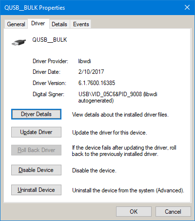 Using Zadig. I pick USB ID 05C6/9008. Select WinUSB (v6.1.7600.16385) and click replace driver. It says installing for a while then says it's successful.